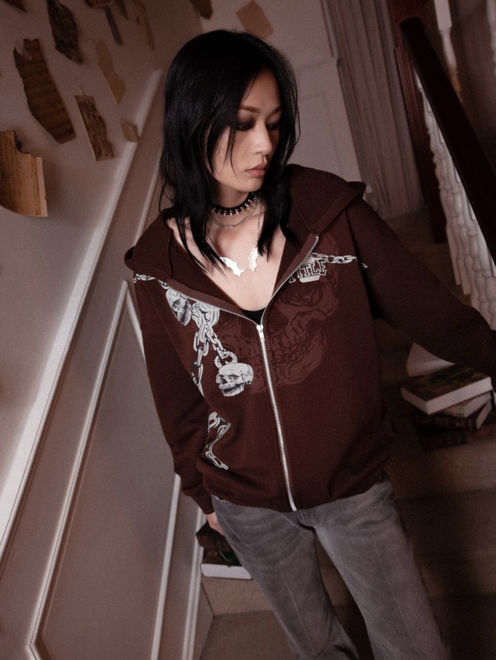 Academia Letter Skull & Chain Graphic Zip Up Hoodie