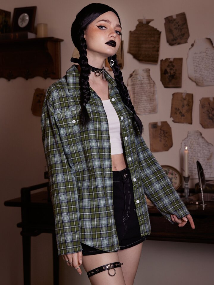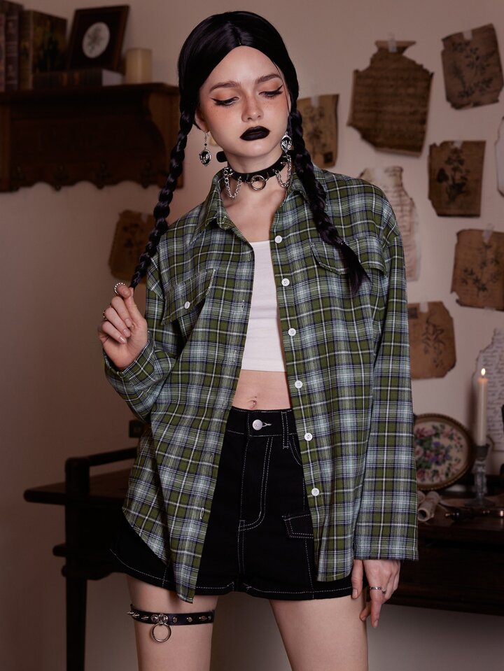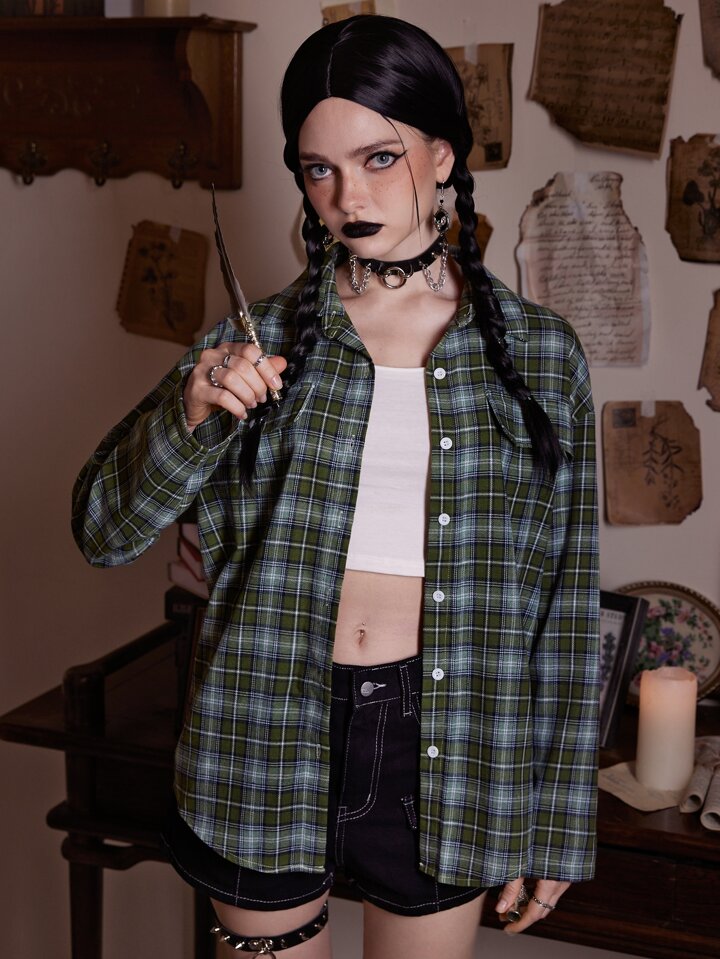 Academia Plaid Print High Low Hem Shirt