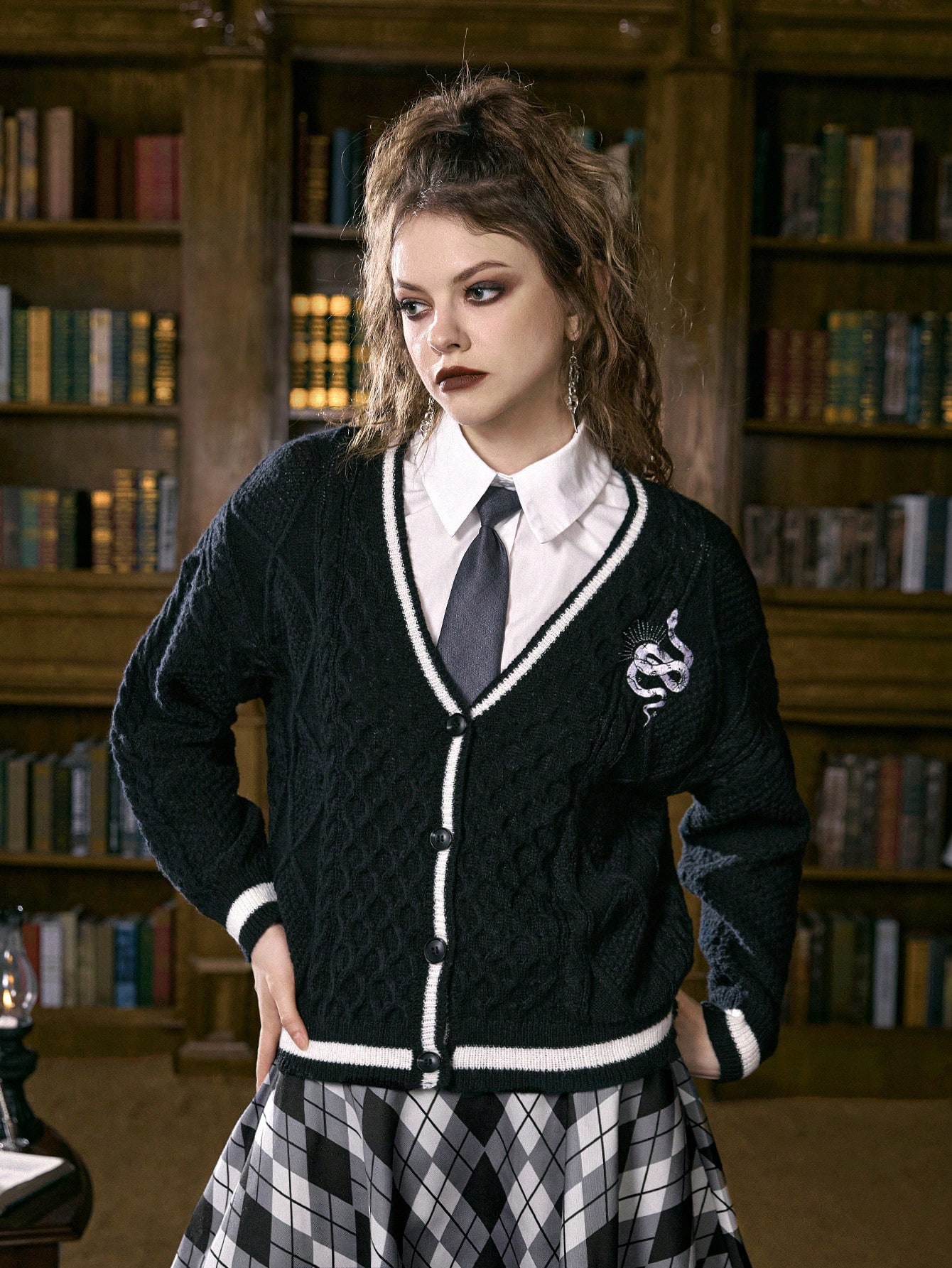 Academia Snake Embroidery Striped Trim Drop Shoulder Cardigan