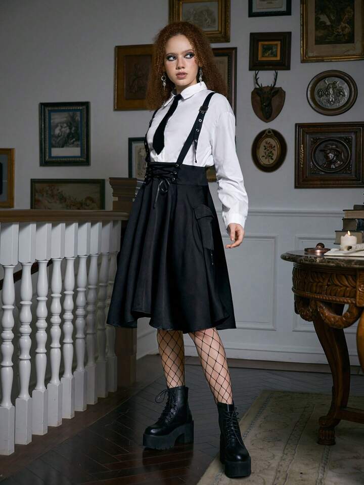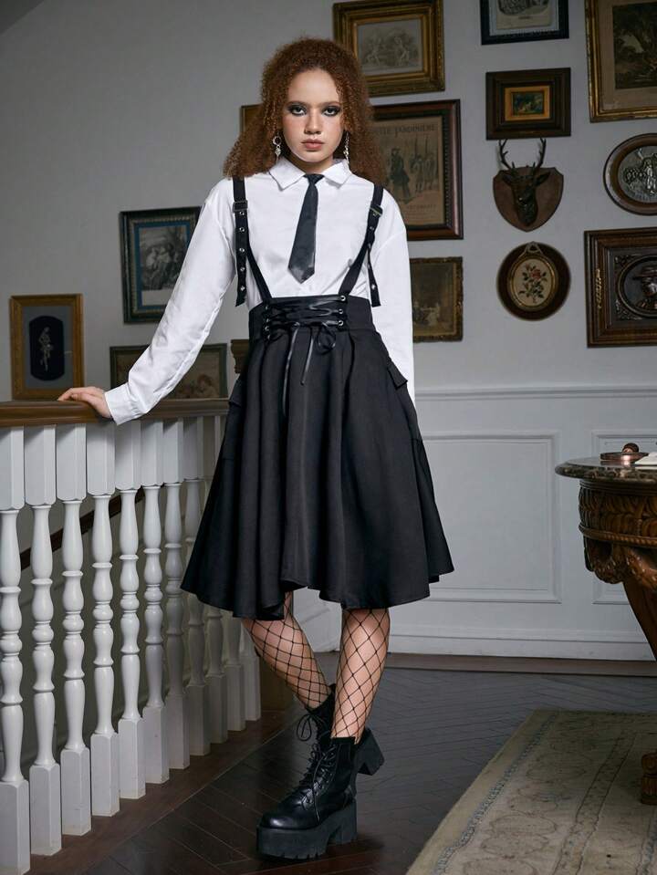 Academia Solid Lace Up Suspender Skirt