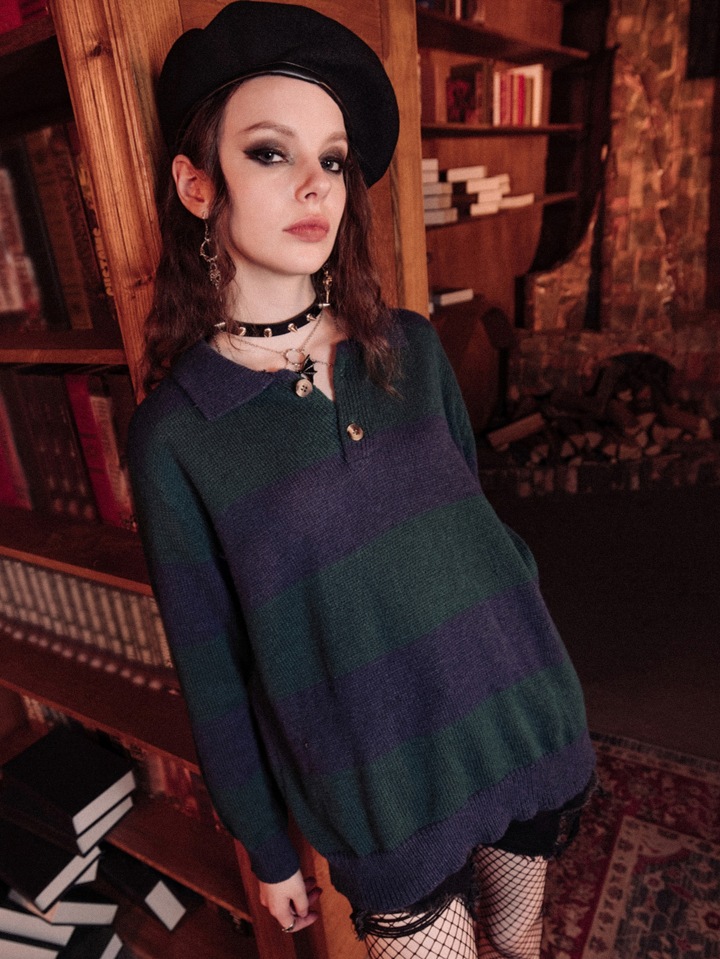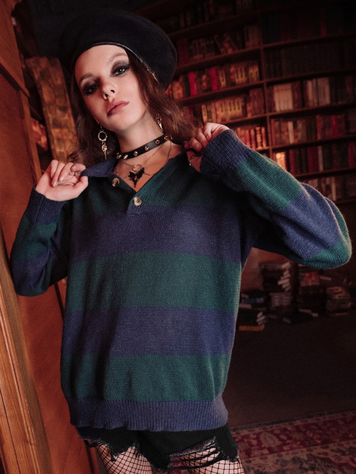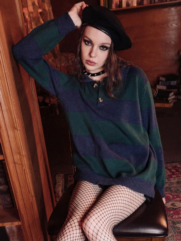 Academia Striped Pattern Button Front Sweater