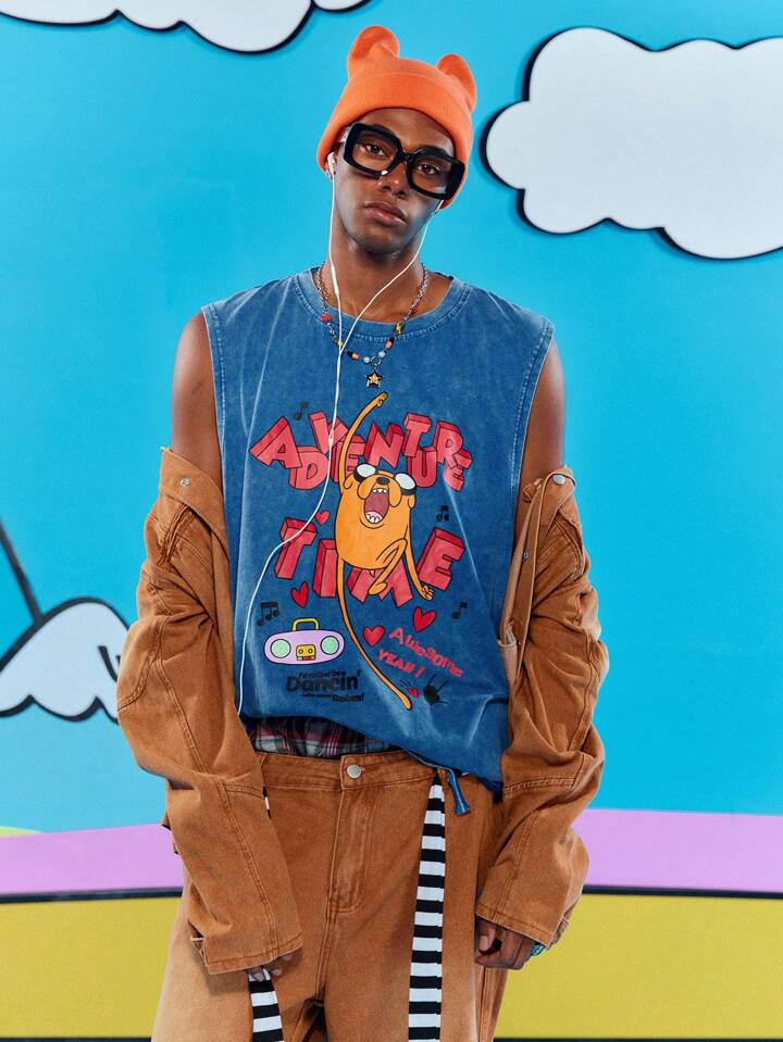 Adventure Time X ROMWE Men's Cartoon And Denim-Effect Print Tank Top, Suitable For Everyday Wear In Spring ,Summer