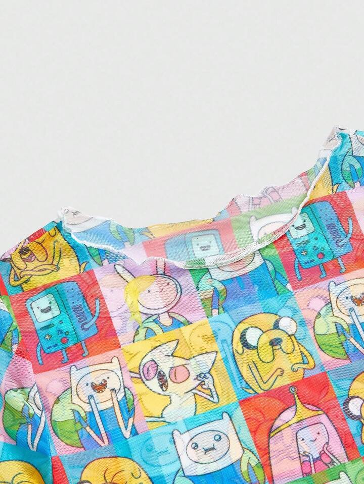 Adventure Time X ROMWE Women Sheer Mesh Cartoon Patchwork Print Short Sleeve Lettuce Trim Top