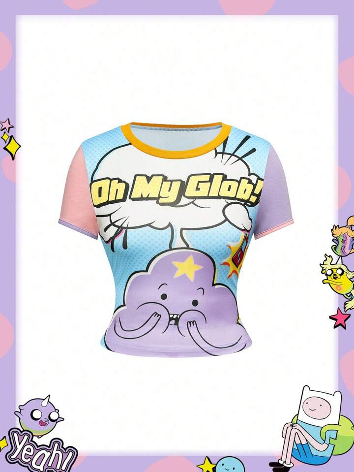 Adventure Time X ROMWE Women's Casual Funny Cute Cartoon & Letter Star Print Short Sleeve Slim Cropped T-Shirt, Summer