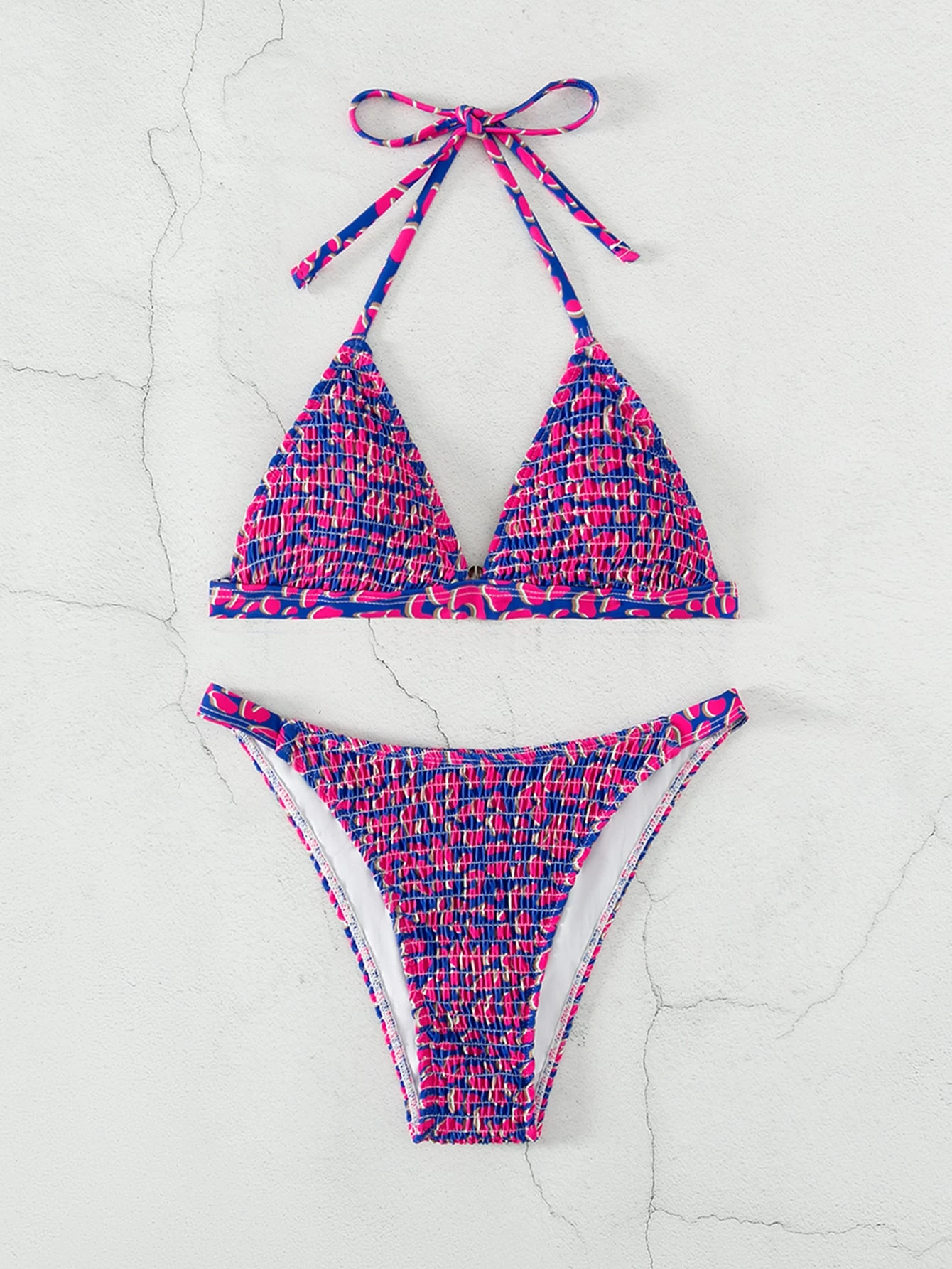 Allover Print Smocked Halter Triangle Summer Beach Bikini Set