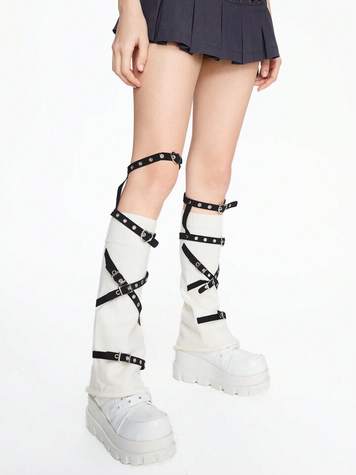 Anime 1 Pair Punk Style Solid Color Leg Warmers With PU Leather Strap, Knitted Thigh High Leg Warmers For Halloween Party Wear And Daily Use, Metal Buckle Decor