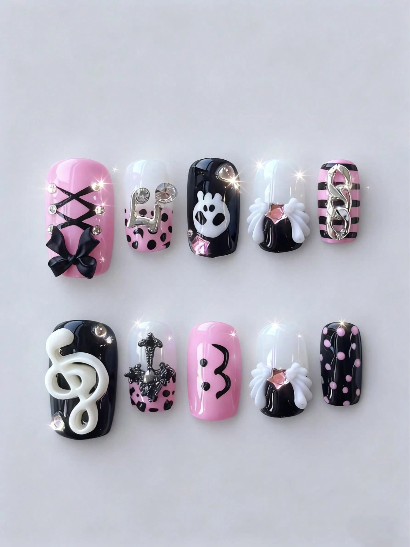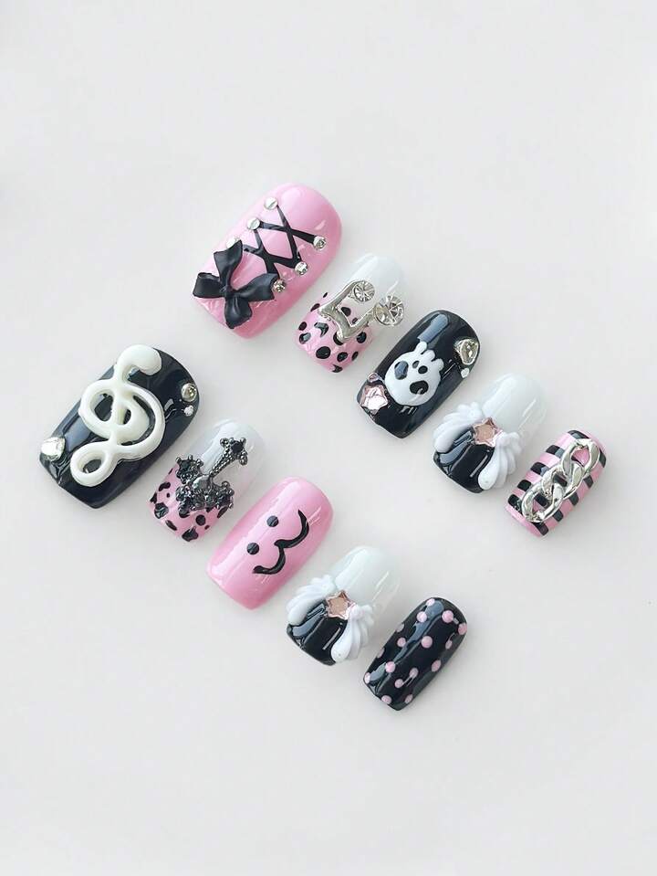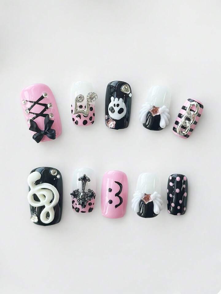 Anime 10pcs Cute Bowknot Music Note Star Element High Quality Handmade False Nails + 3pcs Double-Sided Adhesive, Y2K French Style Rhinestone Chain Polka Dot Removable Nail Art Stickers, Suitable For Holidays, Parties, Dancing And Daily Wear