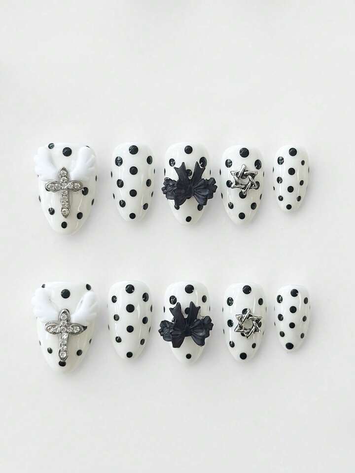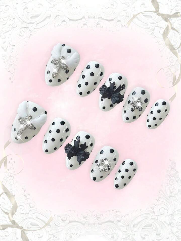 Anime 10pcs Cute Bowknot Music Note Star Element High Quality Handmade False Nails + 3pcs Double-Sided Adhesive, Y2K French Style Rhinestone Chain Polka Dot Removable Nail Art Stickers, Suitable For Holidays, Parties, Dancing And Daily Wear