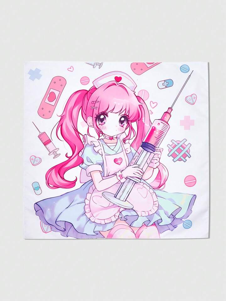 Anime 1pc Cute Cartoon Nurse Girl Printed Small Square Scarf, Versatile Fashion Accessory With Bandage And Syringe Elements