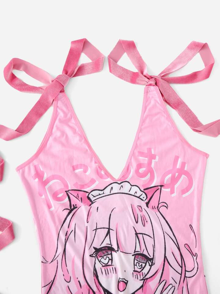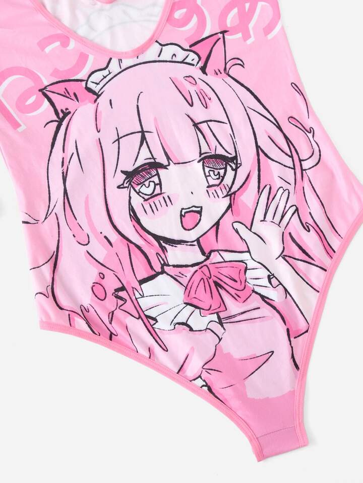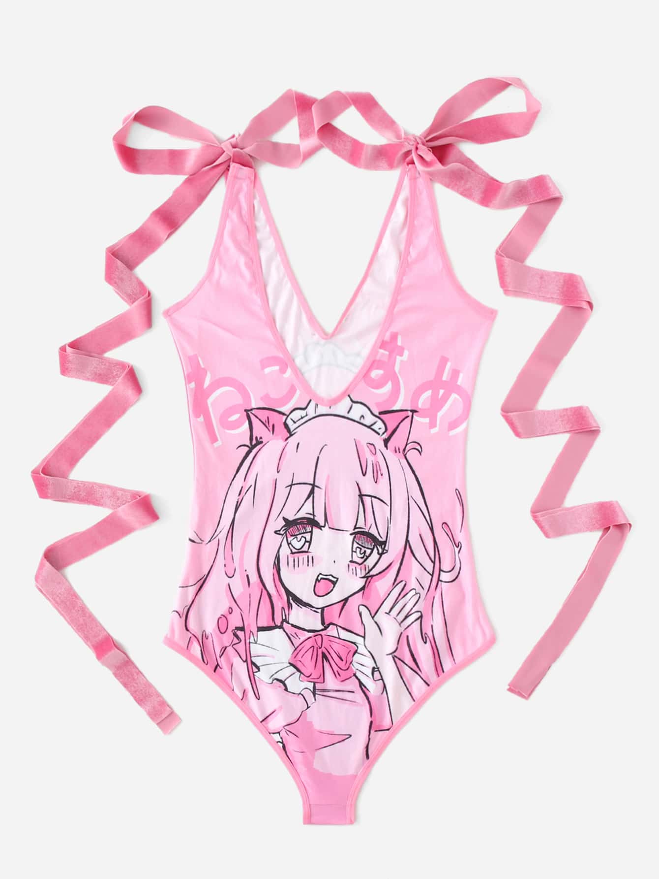 Anime Cartoon Girl Print Tie Shoulder Teddy Bodysuit