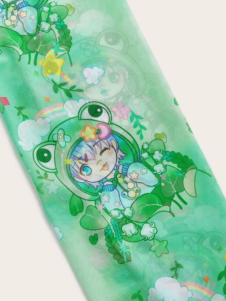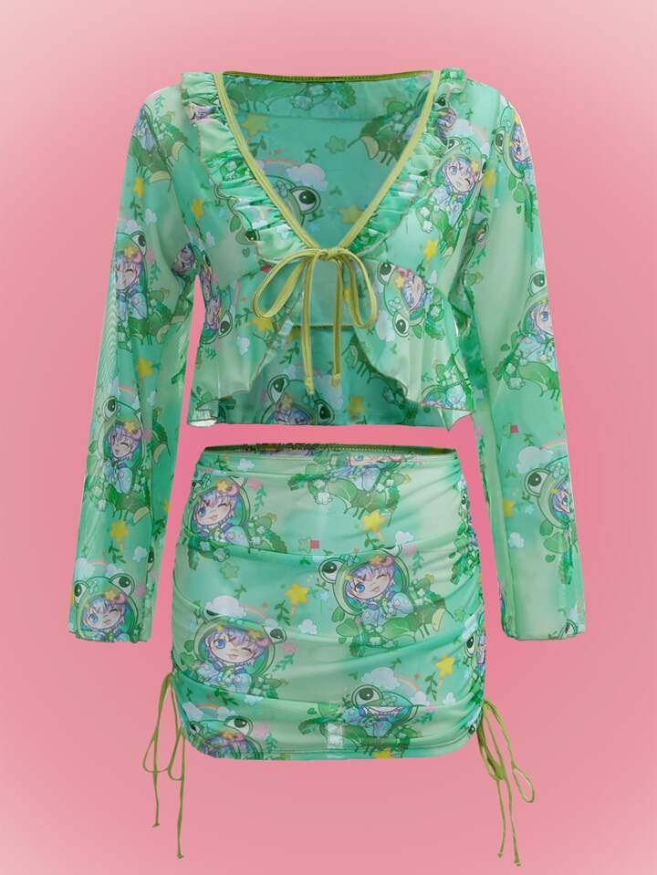 Anime Cartoon Print Drawstring Tie Front Cover Up Set