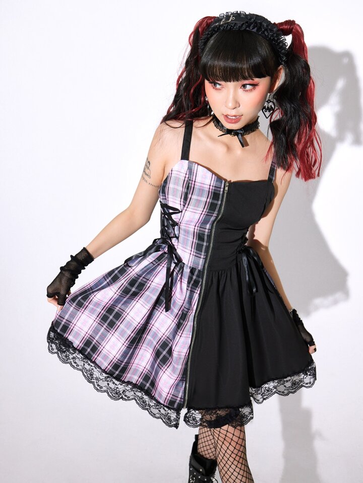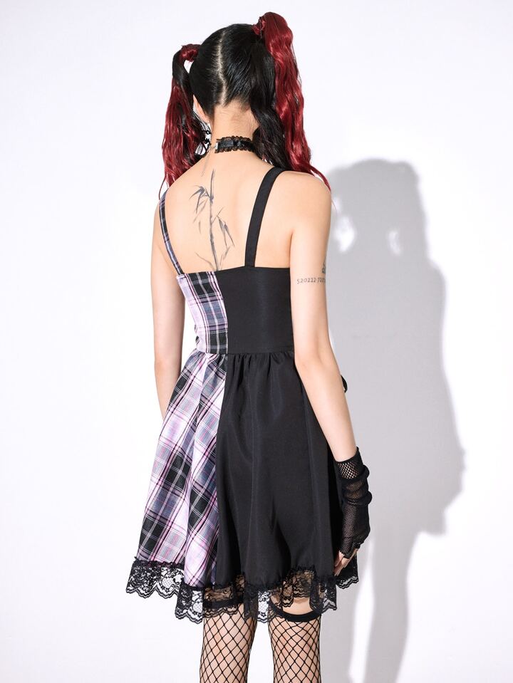 Anime Contrast Lace Plaid Lace Up Cami Dress