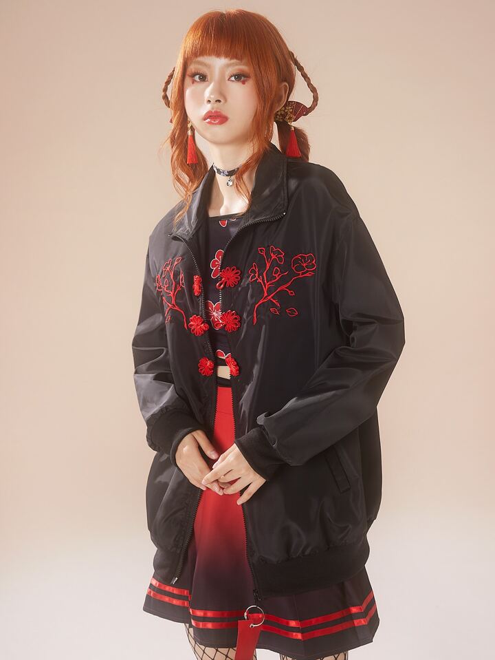 Anime Floral Embroidery Collar Zip Up Windproof Jacket