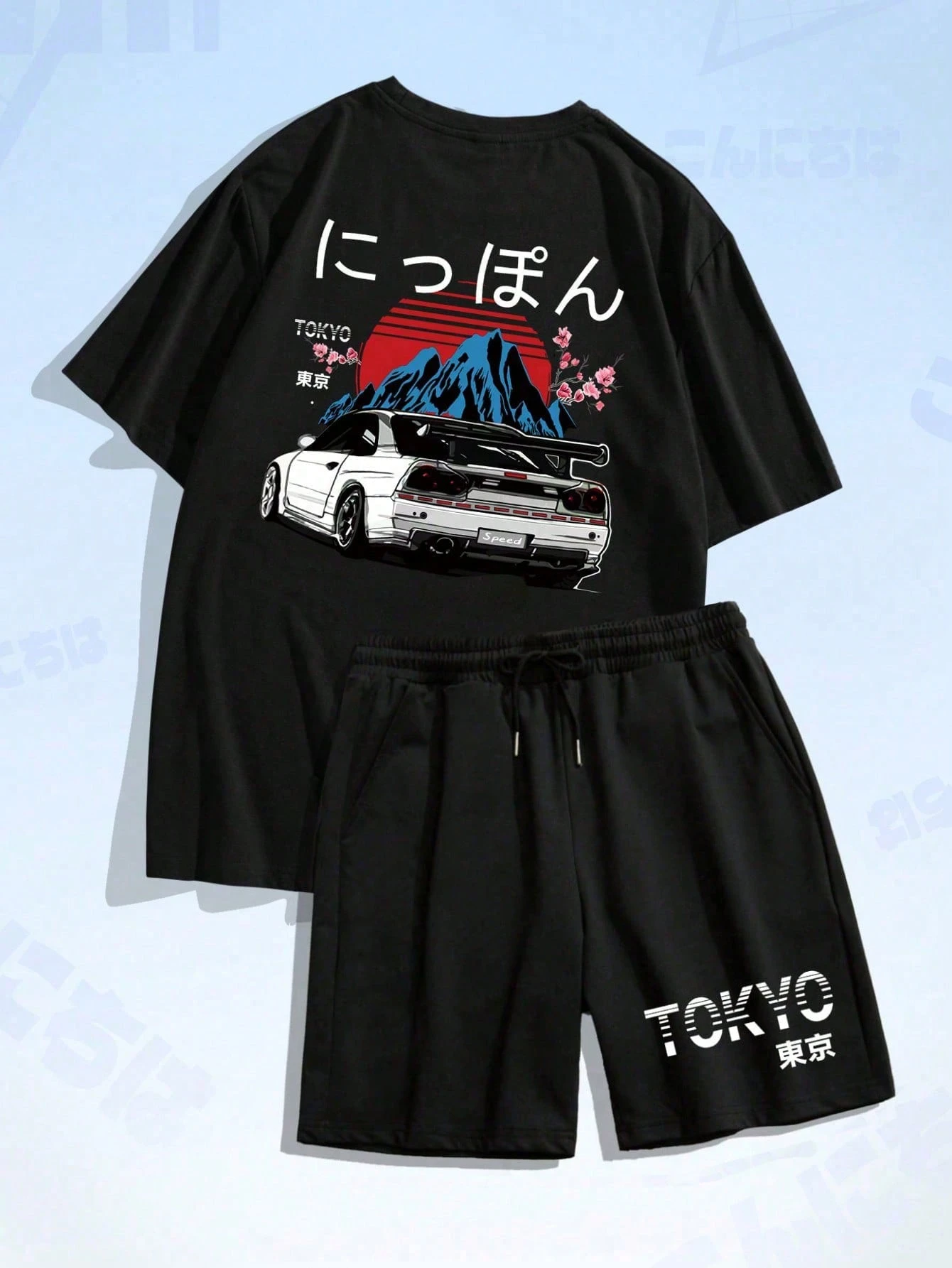Anime Guys Car Japanese Letter Graphic Tee & Drawstring Shorts