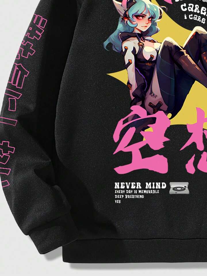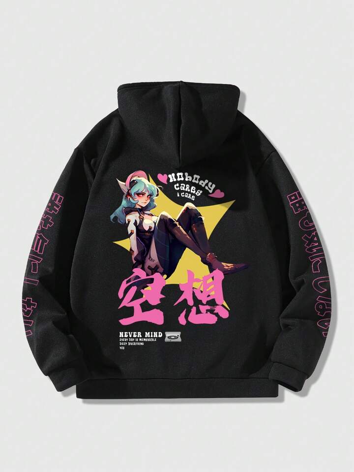 Anime Men Cartoon Character & Letter Printed Hoodie