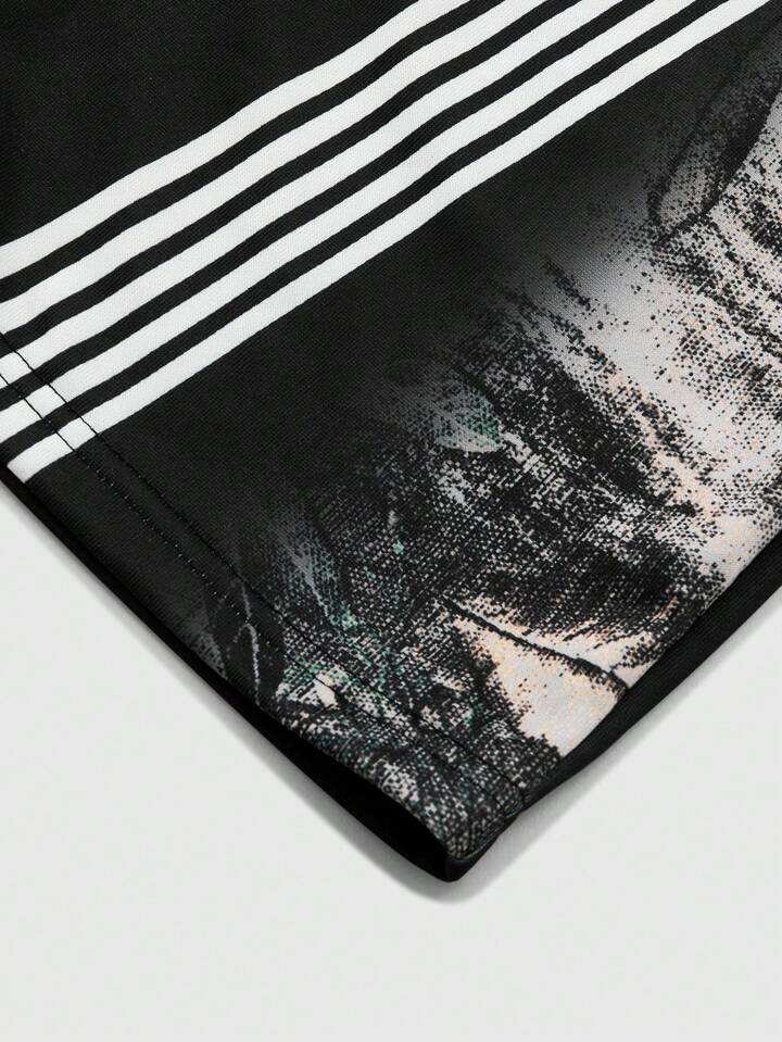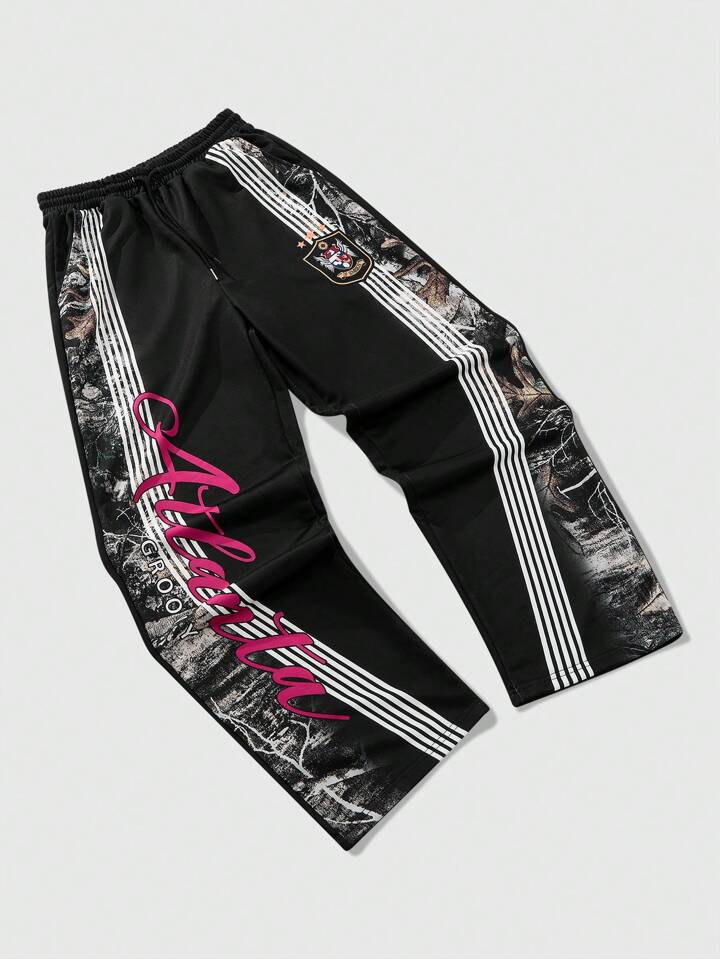 Anime Men Casual Daily Patchwork Striped Branch Print Drawstring Waist Sweatpants