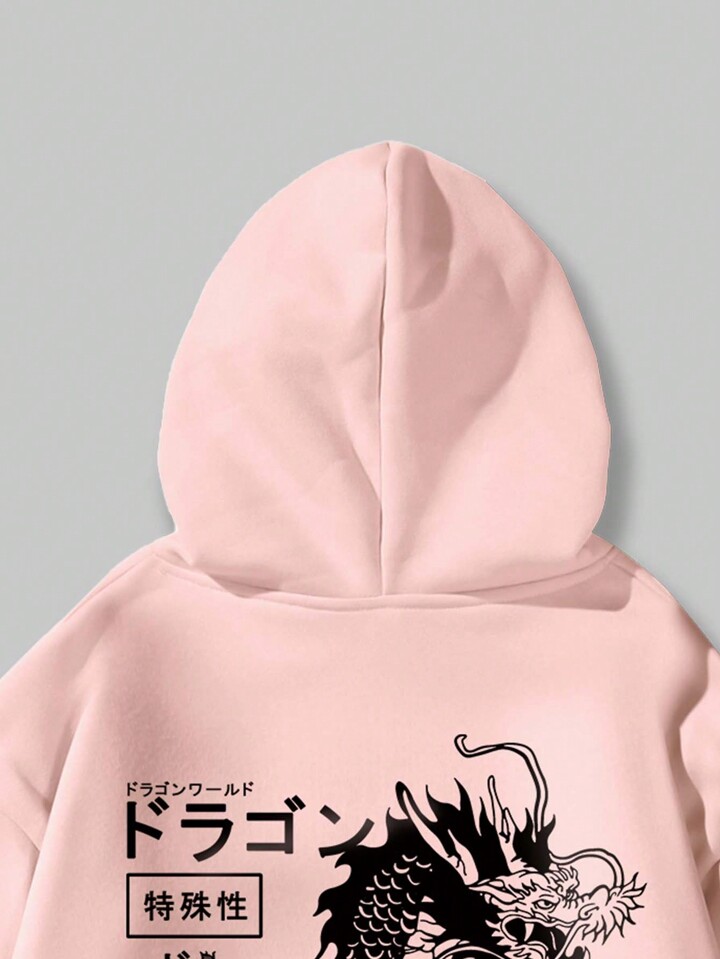 Anime Men Dragon & Letter Graphic Drawstring Thermal Lined Hoodie