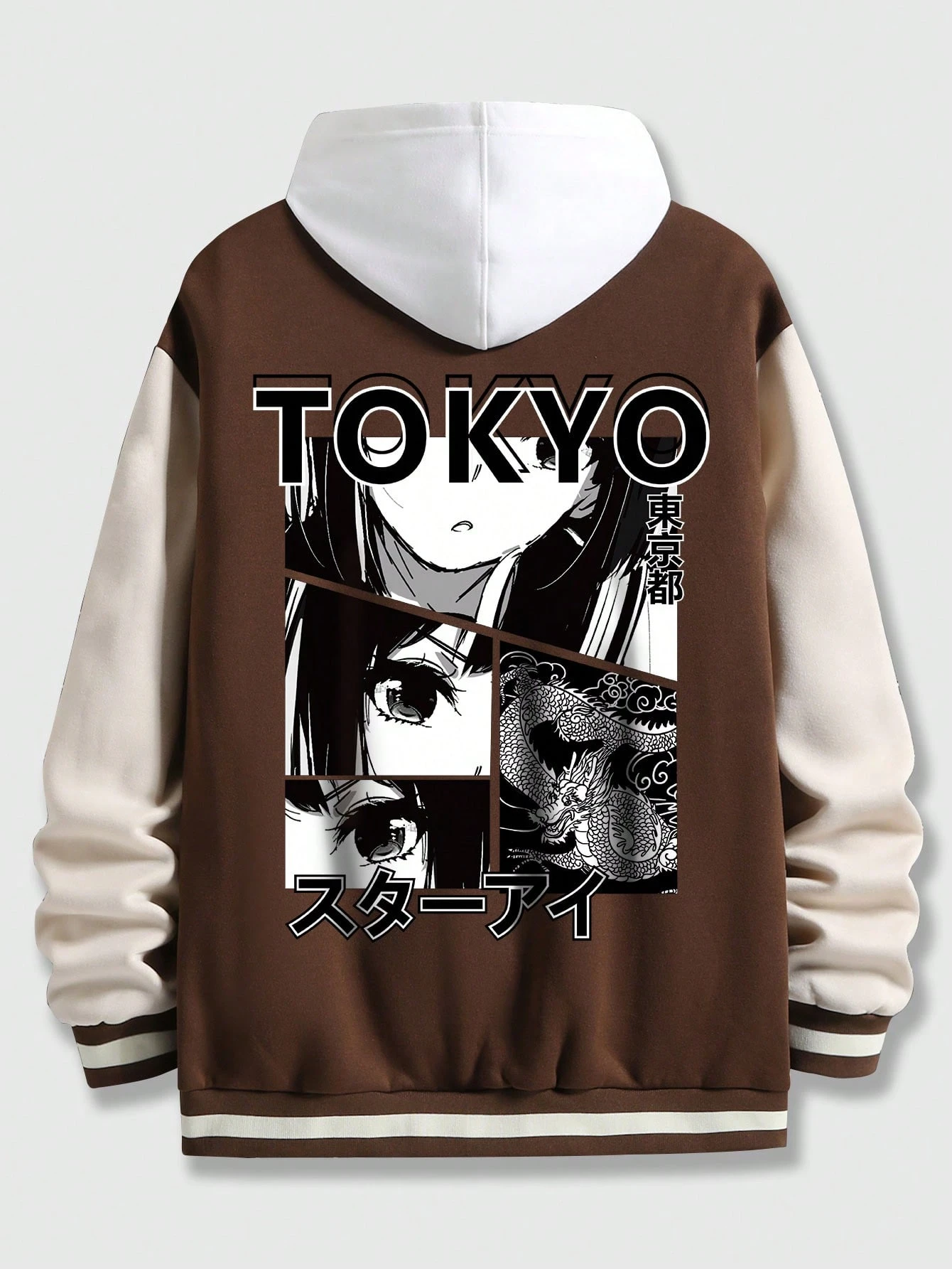 Anime Men Letter & Figure Graphic Two Tone Varsity Jacket Without Hoodie