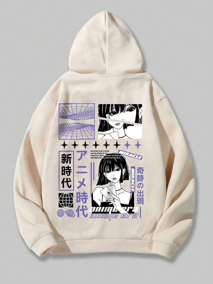 Anime Men Letter Graphic Zip Up Drawstring Thermal Hoodie