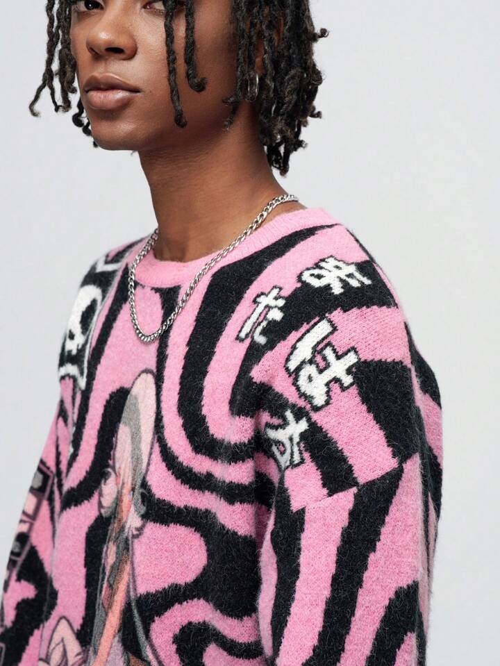 Anime Men's Allover Print Crew Neck Casual Long Sleeve Pullover Sweater