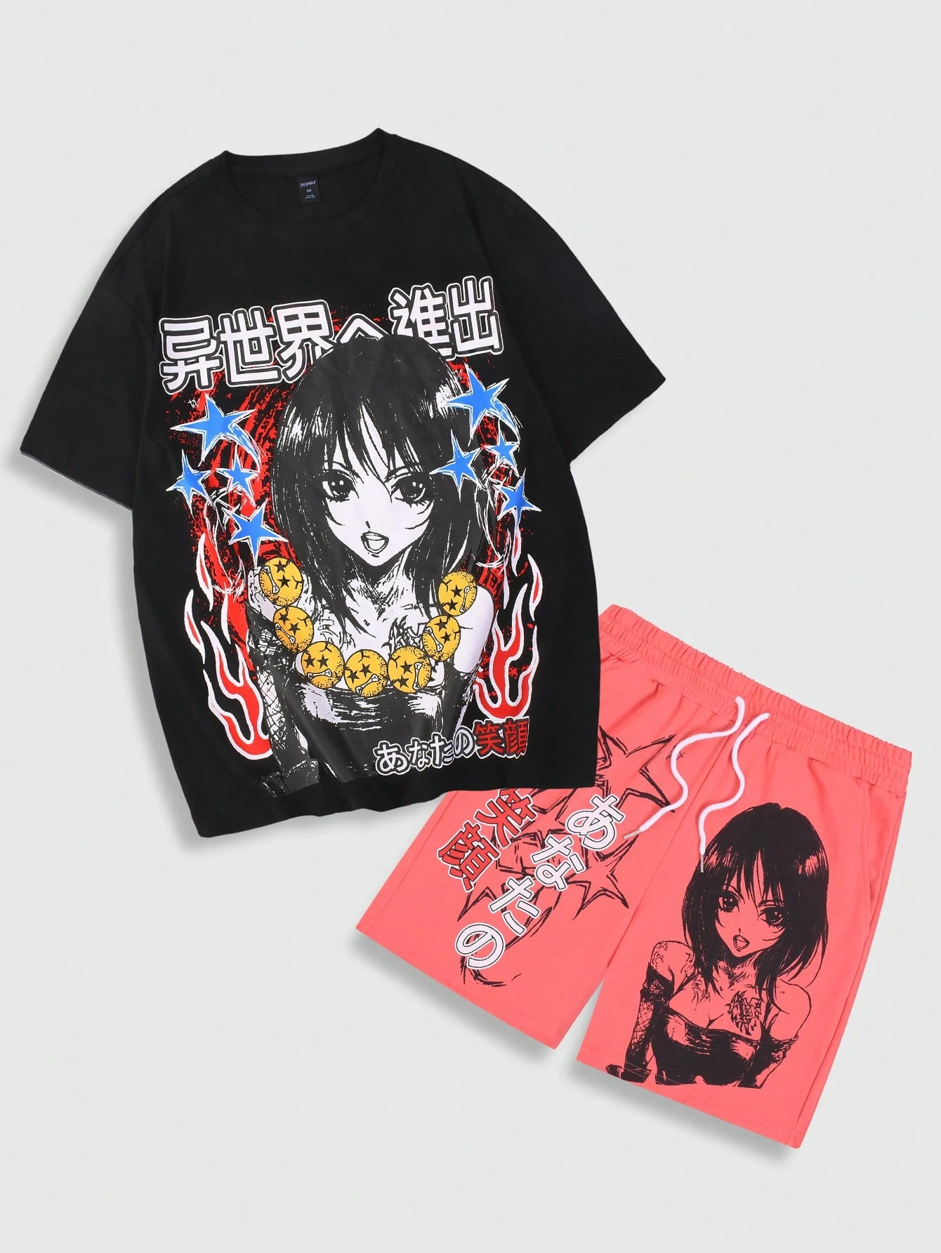 Men's Anime Cartoon Print Short Sleeve T-Shirt And Drawstring Shorts 2-Piece Set