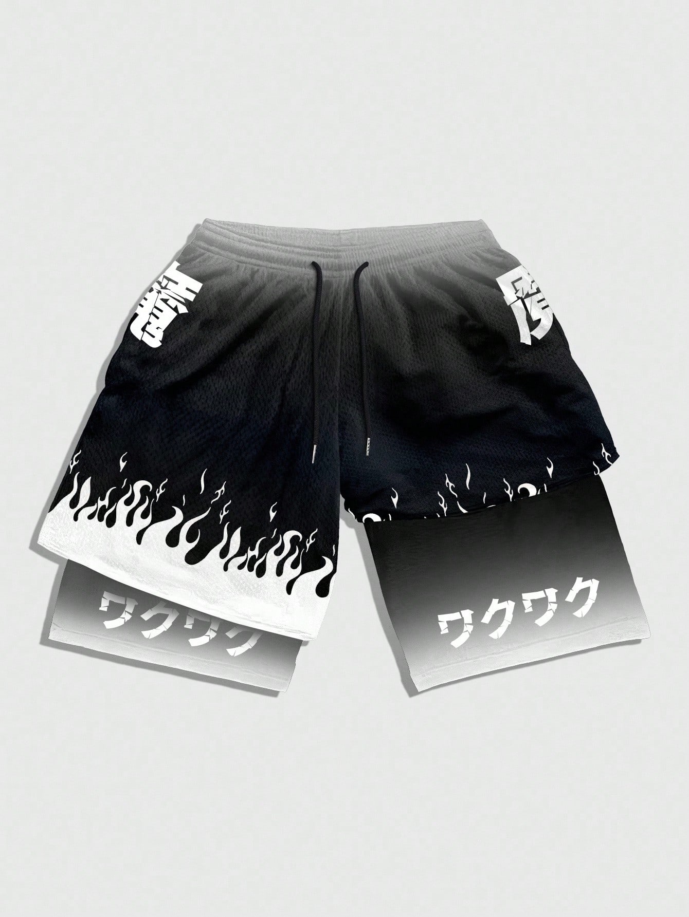Anime Men's Letter & Flame Print Drawstring Waist Double Layer Shorts