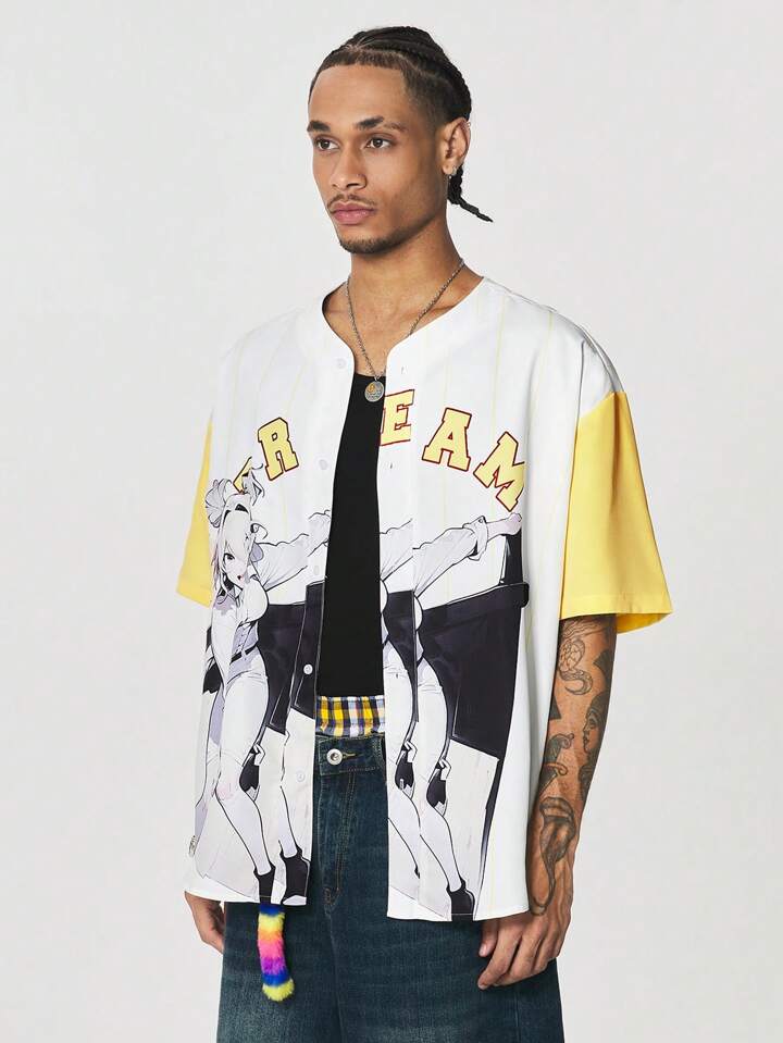 Anime Men's Summer Casual Contrast Color Patchwork Cartoon Character Print Short Sleeve Shirt