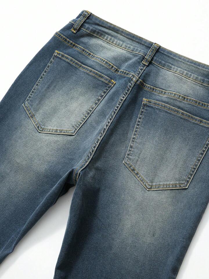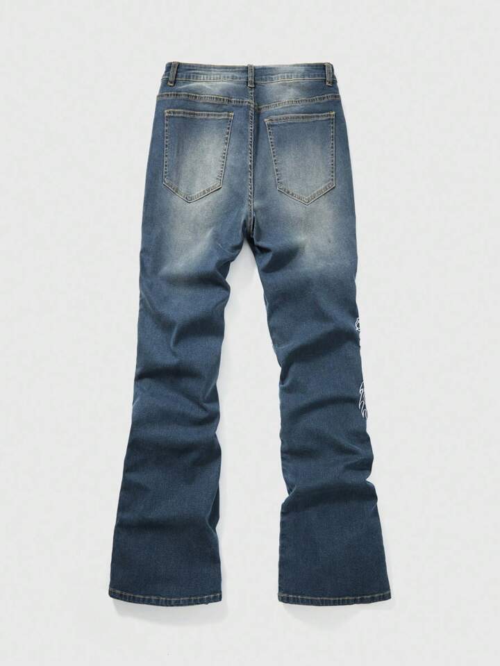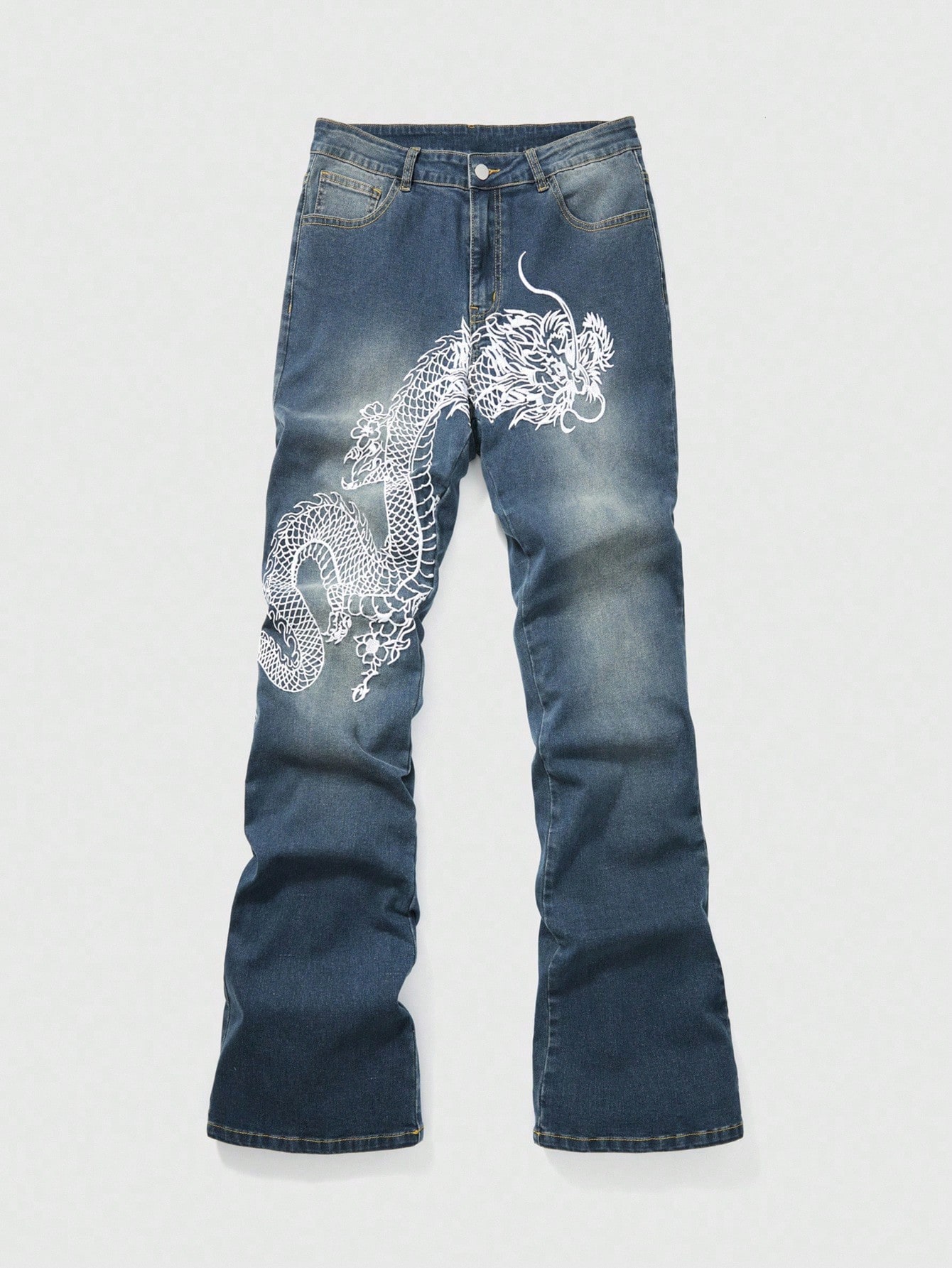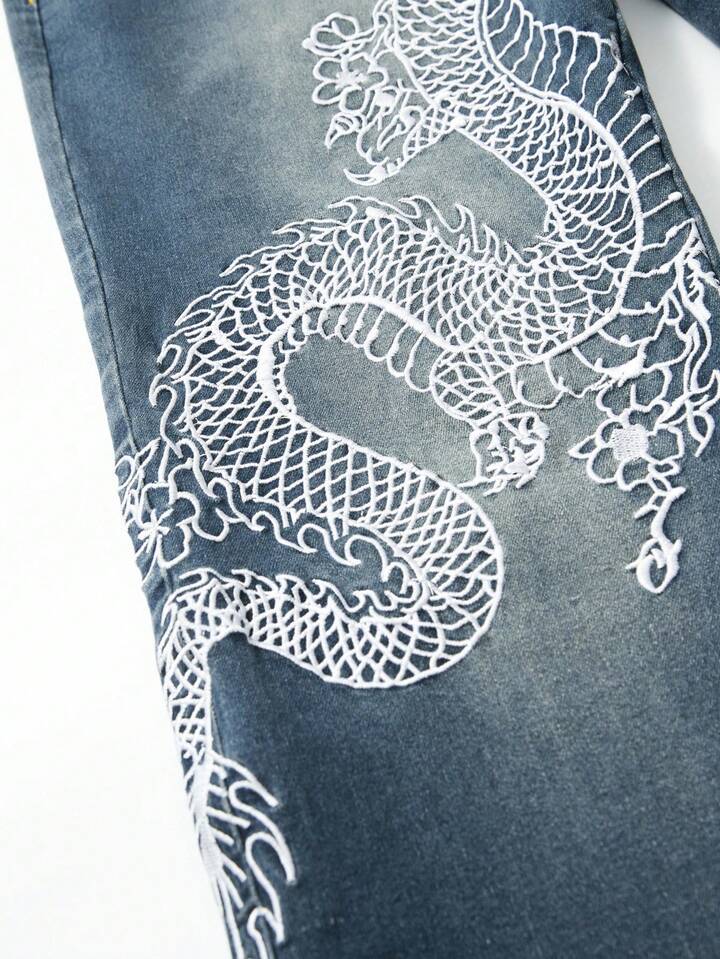 Anime Men's Washed Dragon Pattern Embroidered Denim Jeans