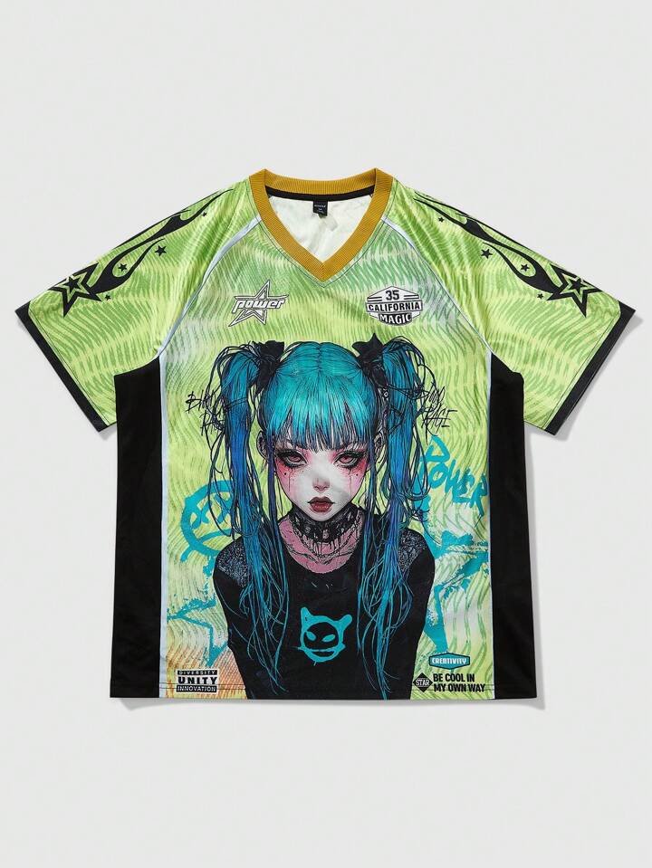 Anime Summer Men's American Streetwear V-Neck Patchwork Mesh Loose Casual Sports Jersey