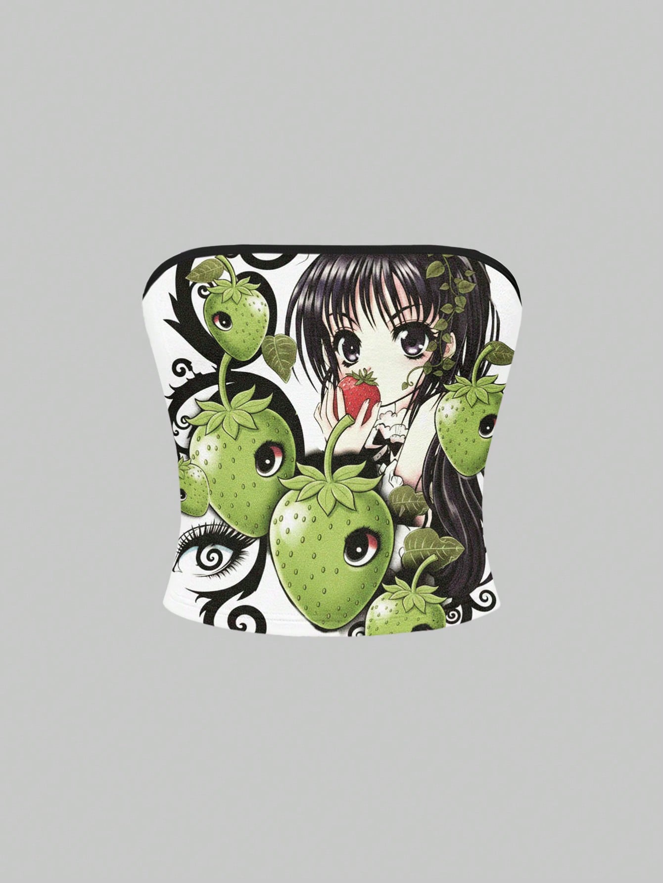Anime SummergraphicwhiteCute Kawaii Dark Horror Hot Girl Strawberry Eyes Vintage Floral Vine Print Spring Tube Top For Women