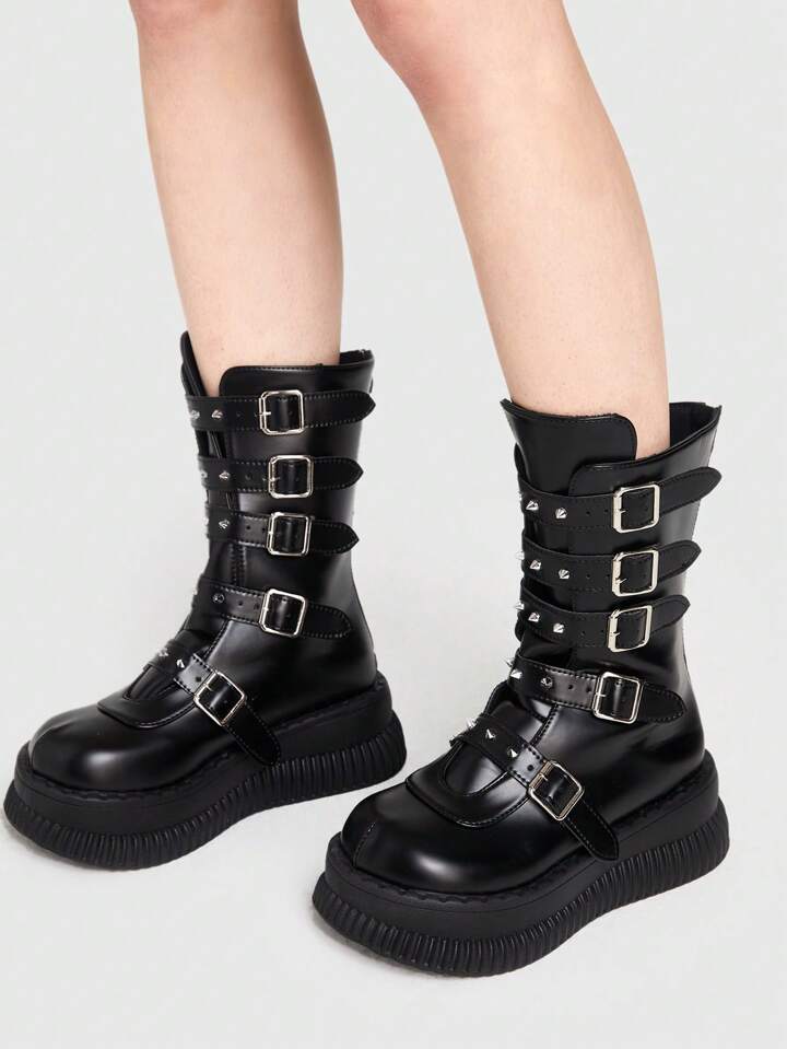 Anime Women Buckle & Spiked Decor Combat Boots, Punk Outdoor Fashion Boots