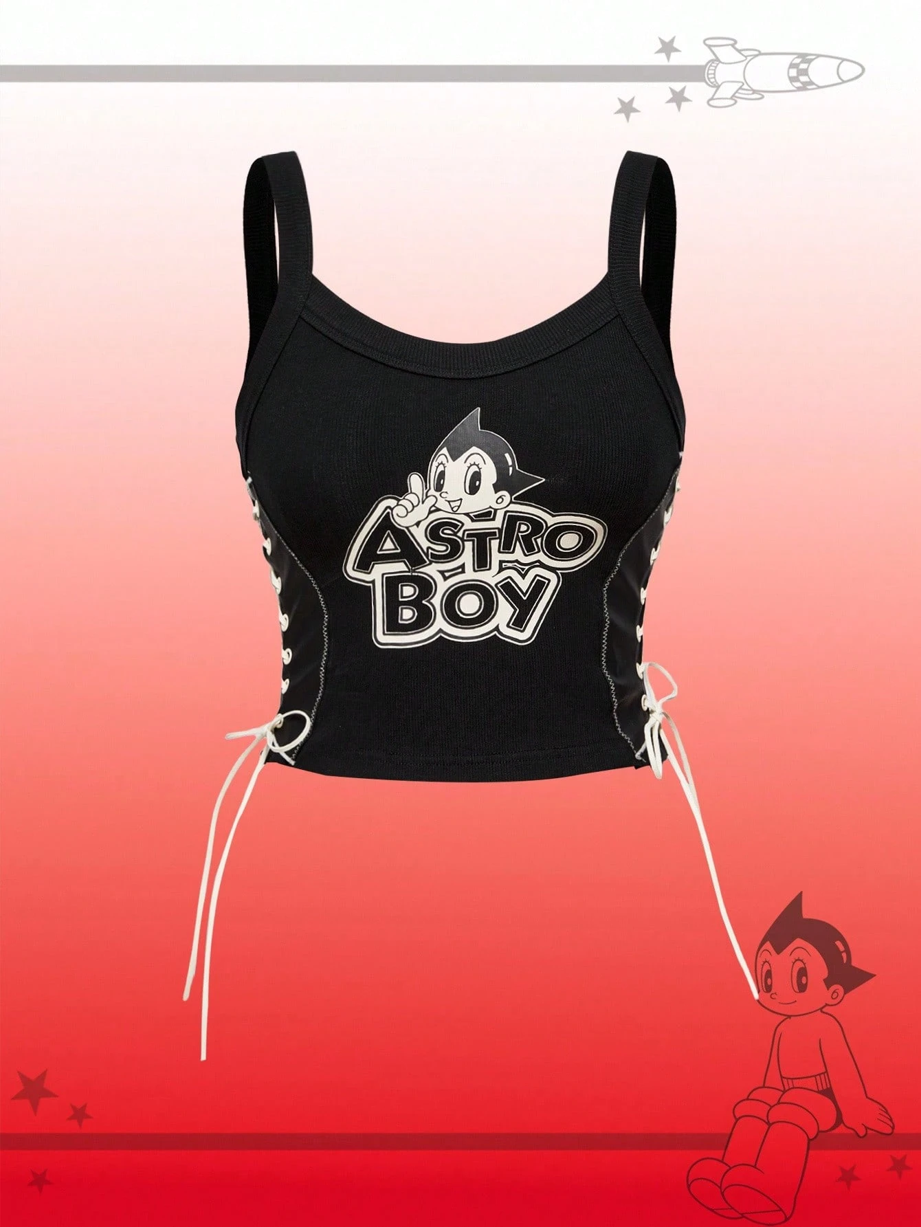 Astro Boy X ROMWE Women Contrast PU Leather Lace Up Side Slim Fitted Cami Top