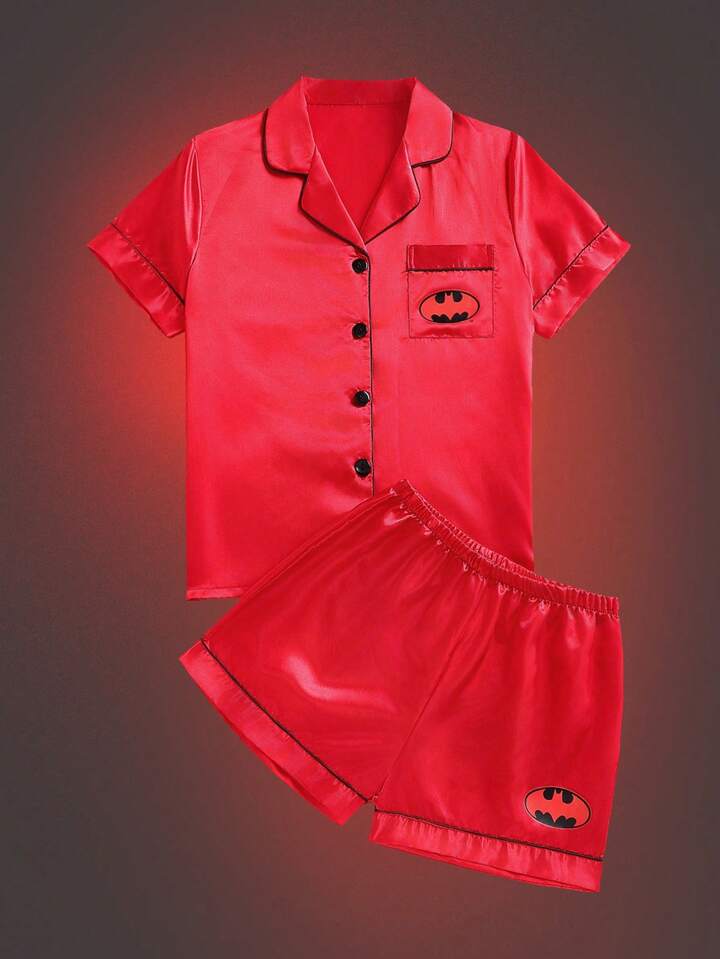 Batman X ROMWE Satin Turndown Collar Bat Print Short Sleeve Top And Shorts Casual Summer Pajama Set