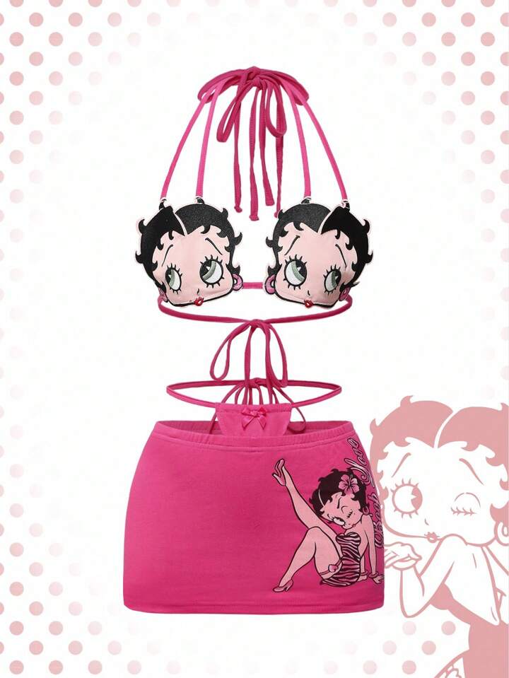 Betty Boop | ROMWE Cartoon Figure Graphic Y2K Sexy Betty Graphic Print Triangle Bralette & Ruffled Waist Low-Waist Super Short Skirt 2 Pieces Set
