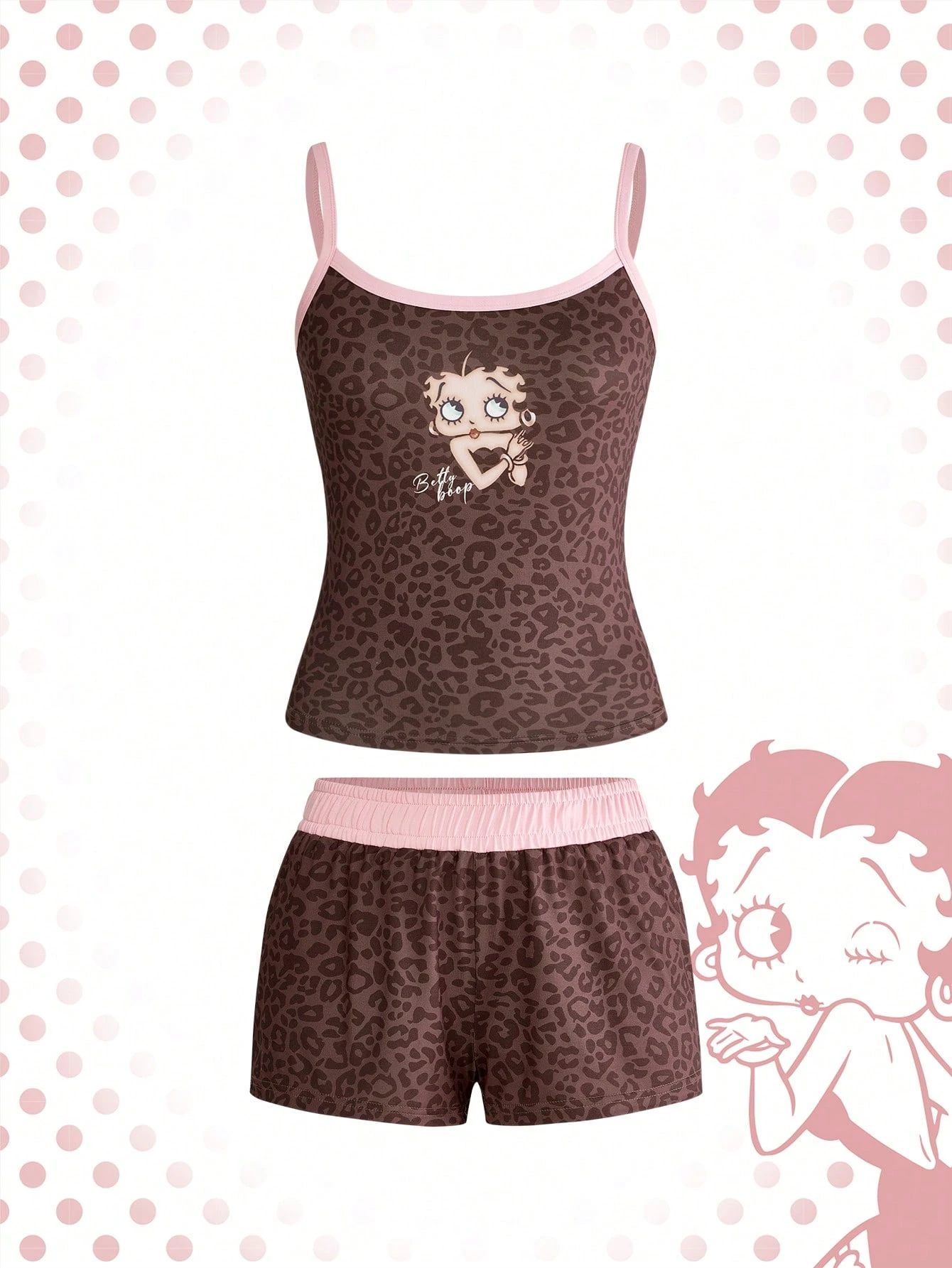 Betty Boop | ROMWE Leopard Print Contrast Trim Camisole & Shorts Sleepwear Set