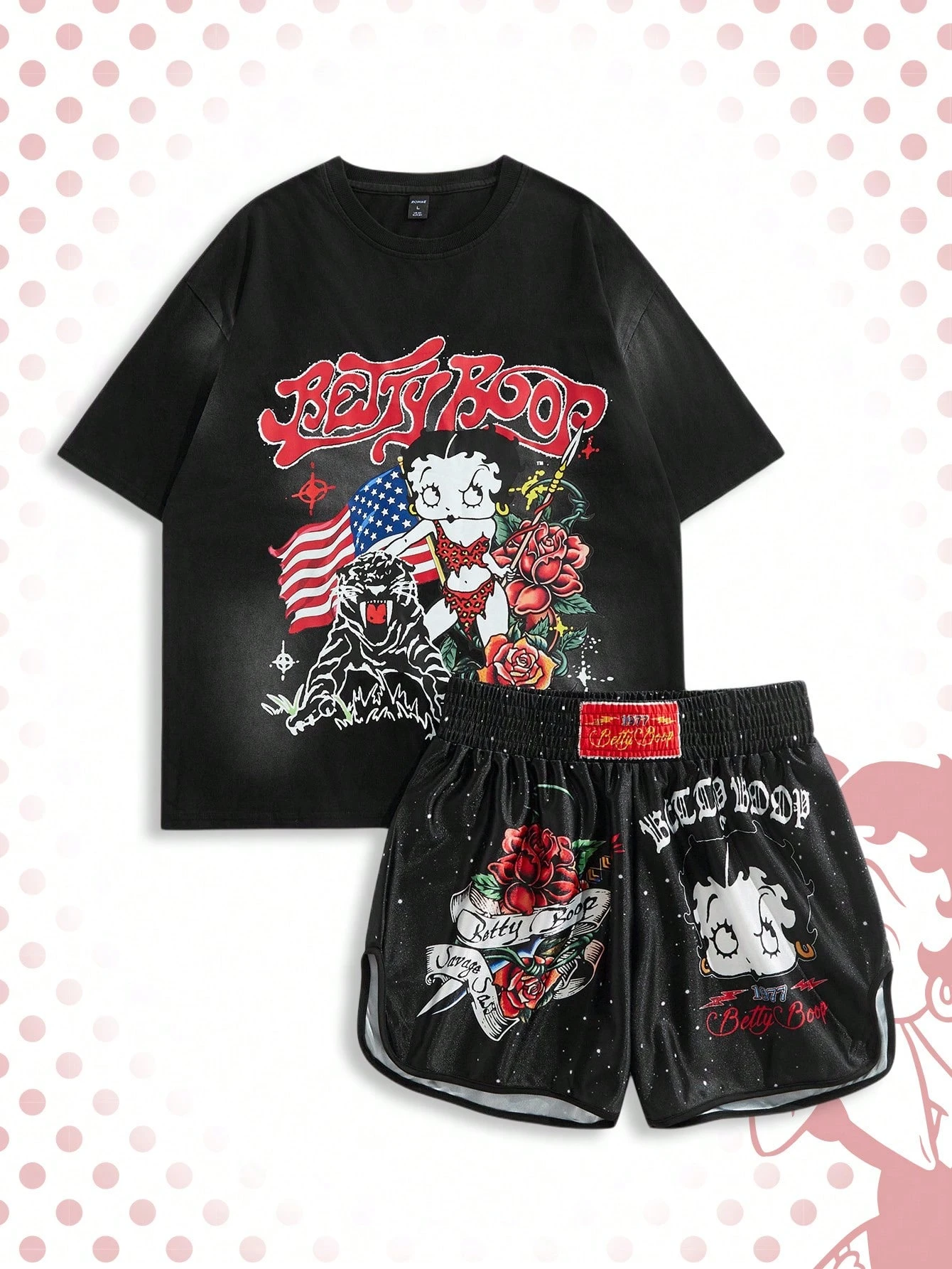 Betty Boop | ROMWE Men's 2pcs Casual Letter & Figure Graphic Round Neck Short Sleeve T-Shirt And Shorts Set, Summer