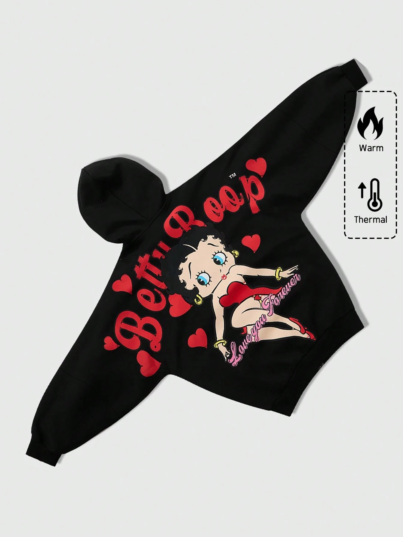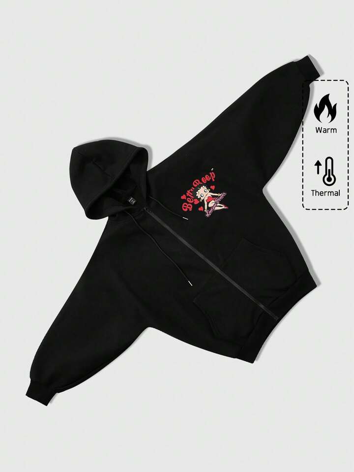 Betty Boop | ROMWE Men's Zipper Hoodie With Street American Design, Batwing Sleeve, Cartoon Figure & Letter Graphic , Fall Winter