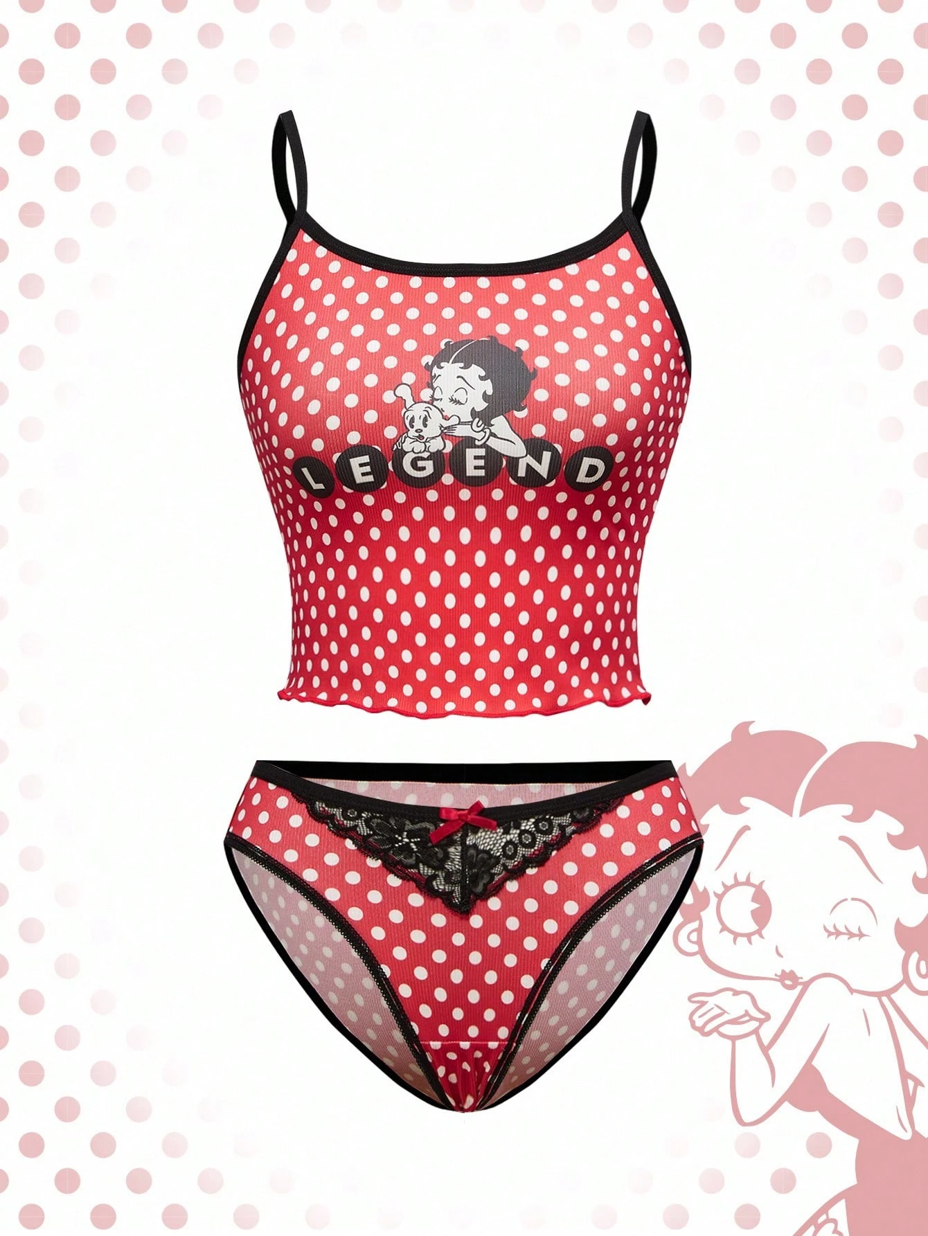 Betty Boop | ROMWE Polka Dot & Cartoon Pattern Soft Cup Camisole Bra And Panty Set