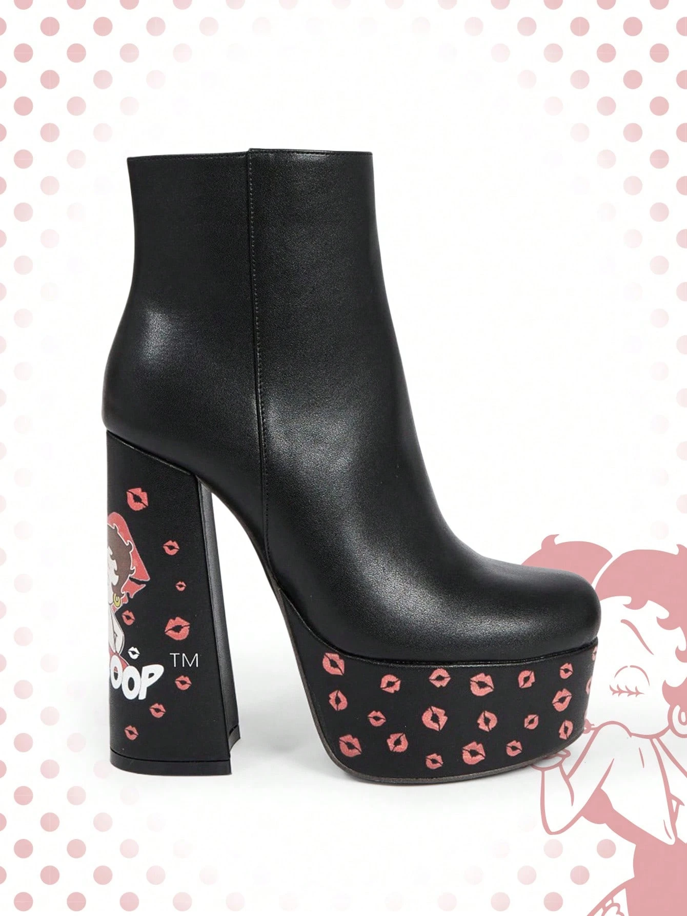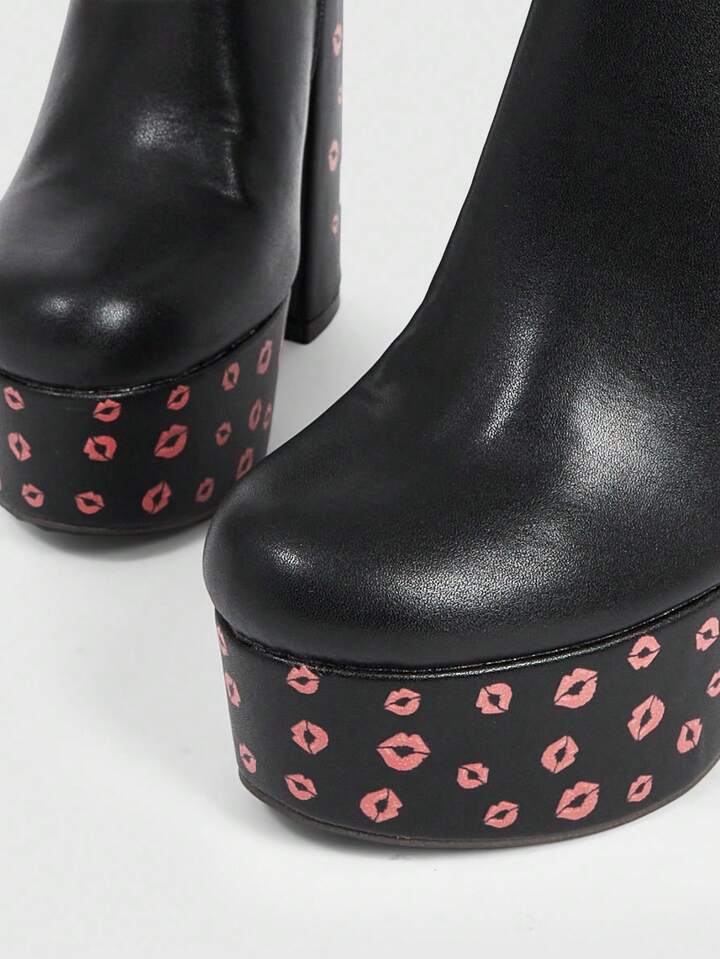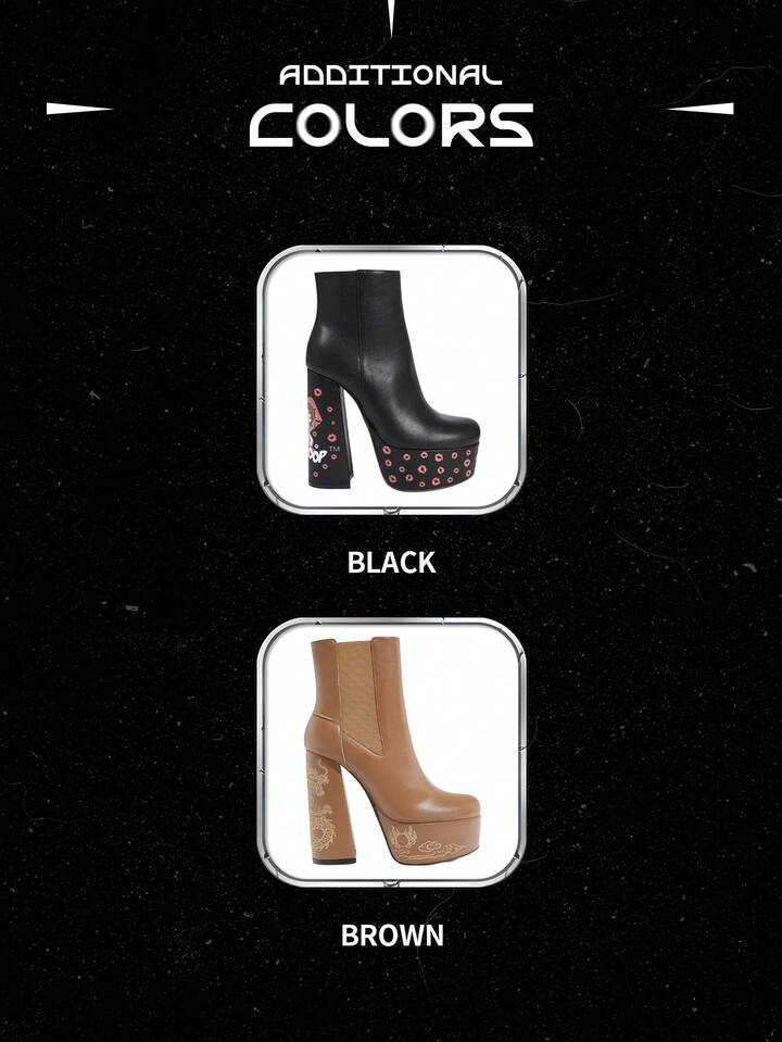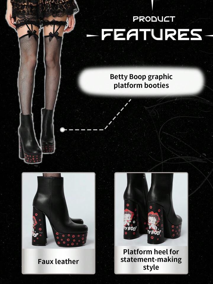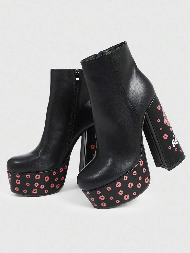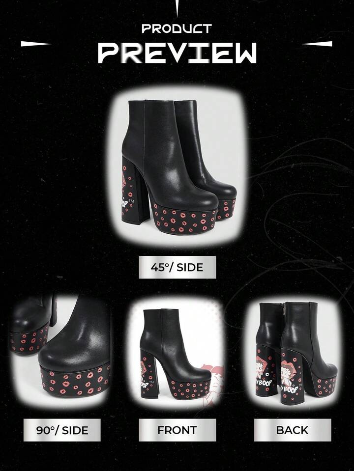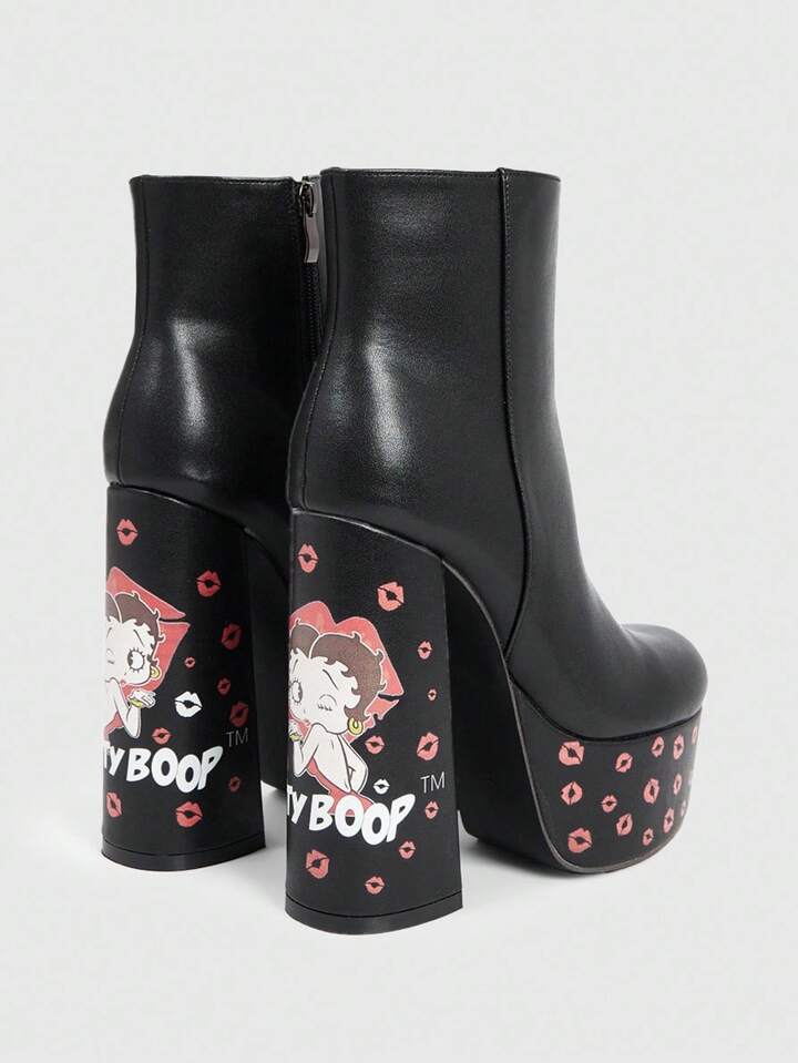 Betty Boop | ROMWE Women's Black Square Toe Chunky Heel Platform Cartoon Pattern Fashion Party Side Zipper Ankle Boots And Short Boots