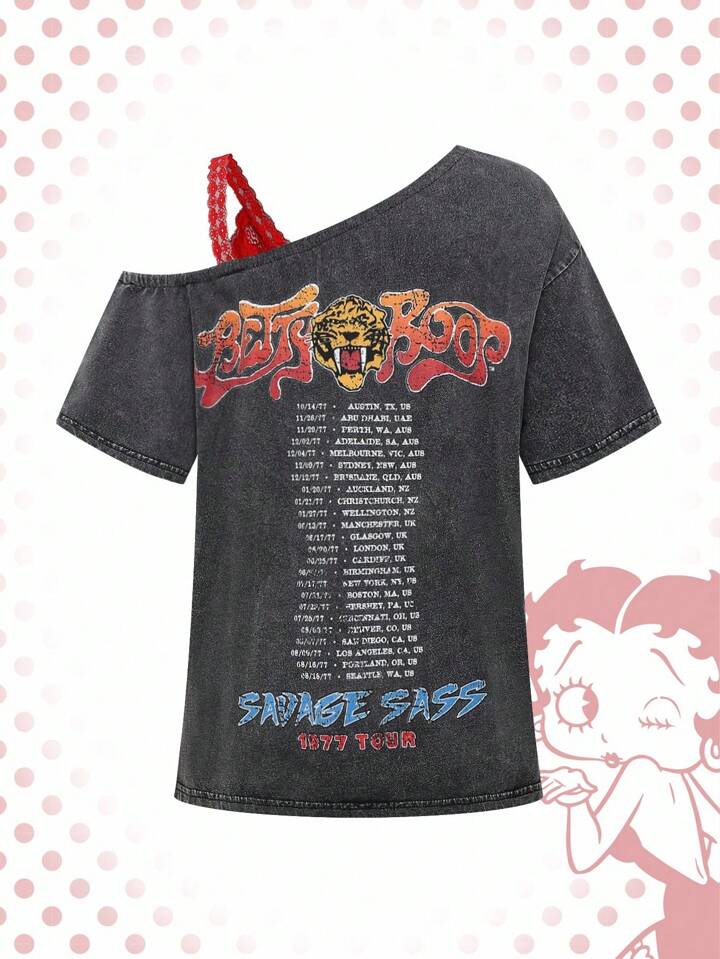Betty Boop | ROMWE Women's Contrast Lace Cartoon Graphic Loose Fit Asymmetrical Shoulder T-Shirt