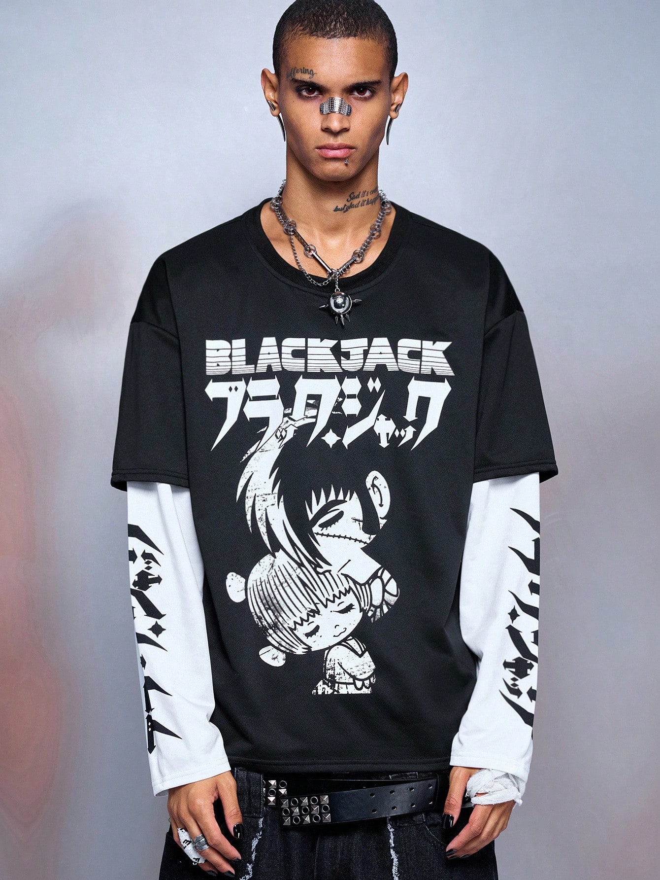 Black Jack X ROMWE Men's Casual Letter & Cartoon Graphic Contrast Color Long Sleeve 2 In 1 T-Shirt, Autumn