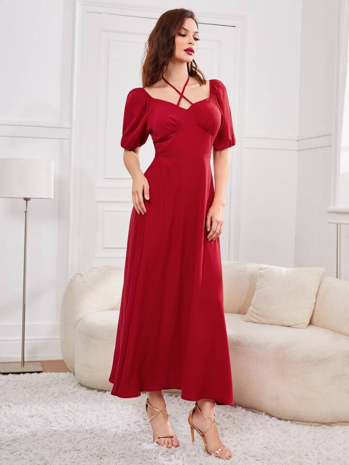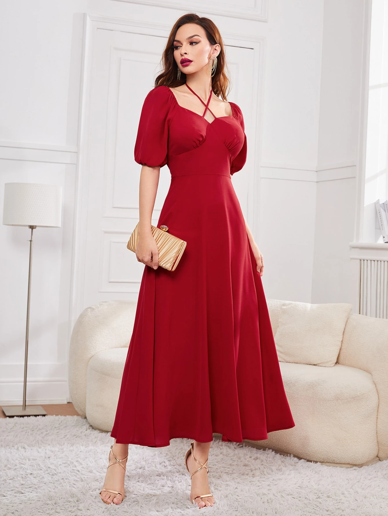 Burgundy Red Crisscross Halter Neck Puff Sleeve A-Line Dress