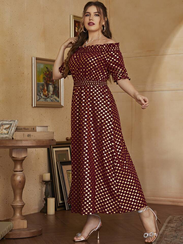 Burgundy Red Plus Geo Gilding Bardot Dress