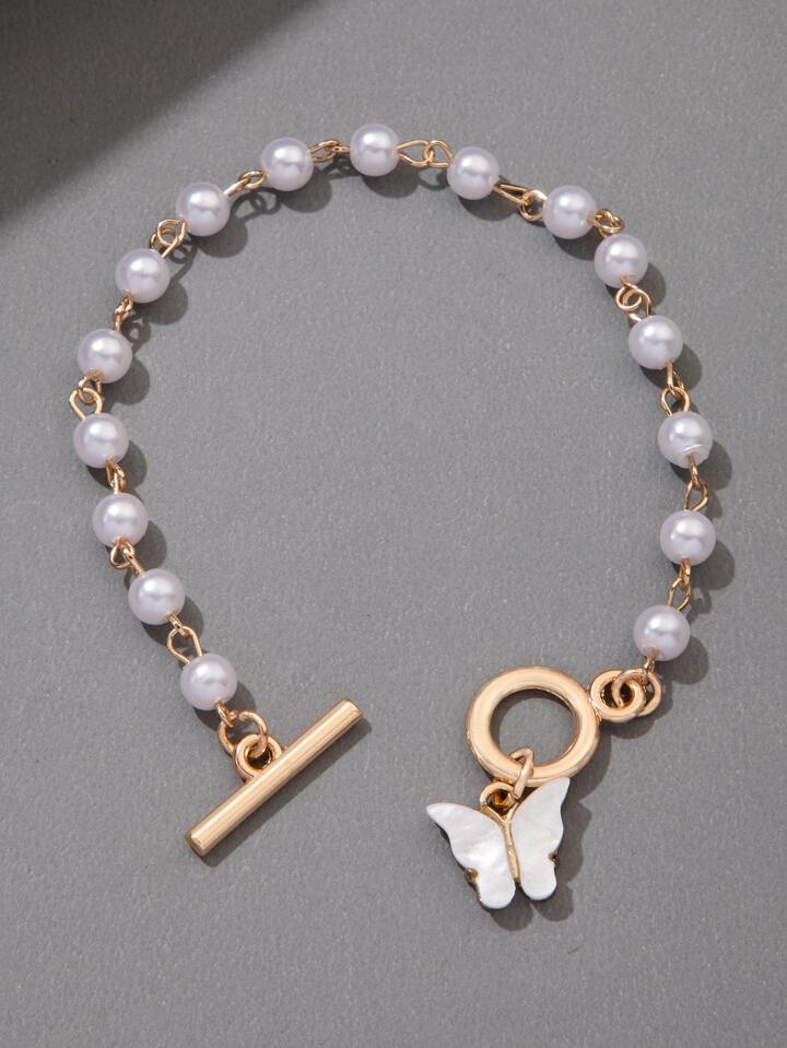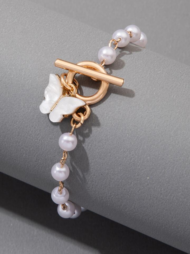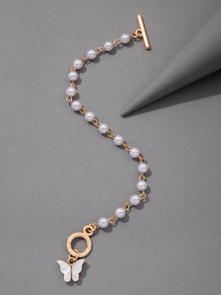 Butterfly Charm Faux Pearl Decor Bracelet