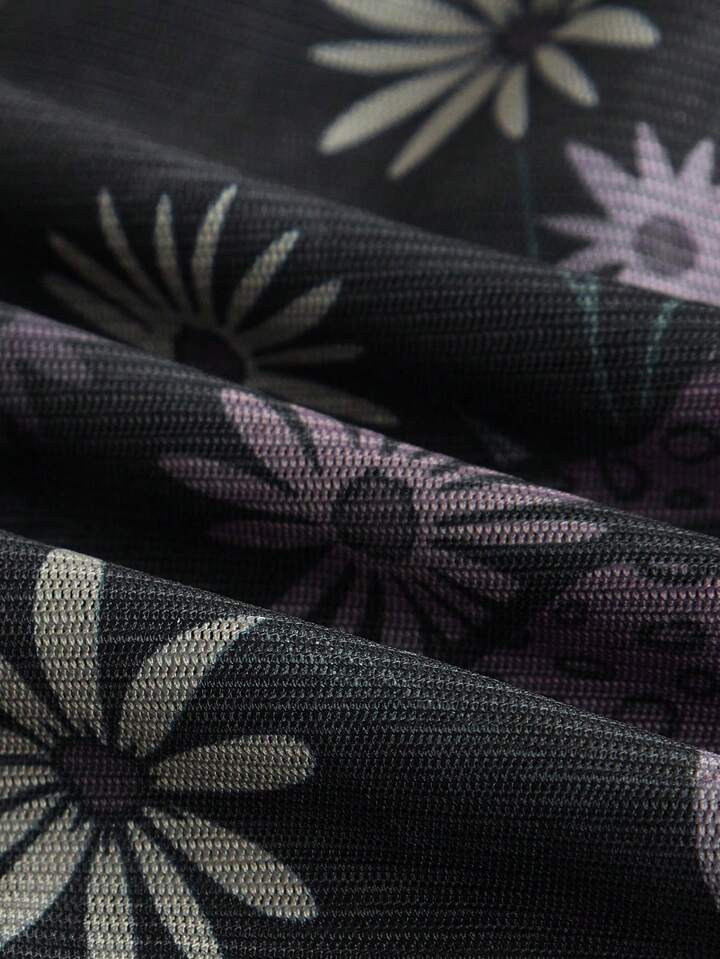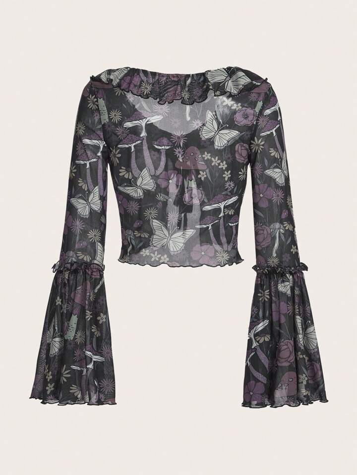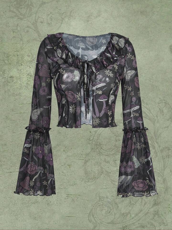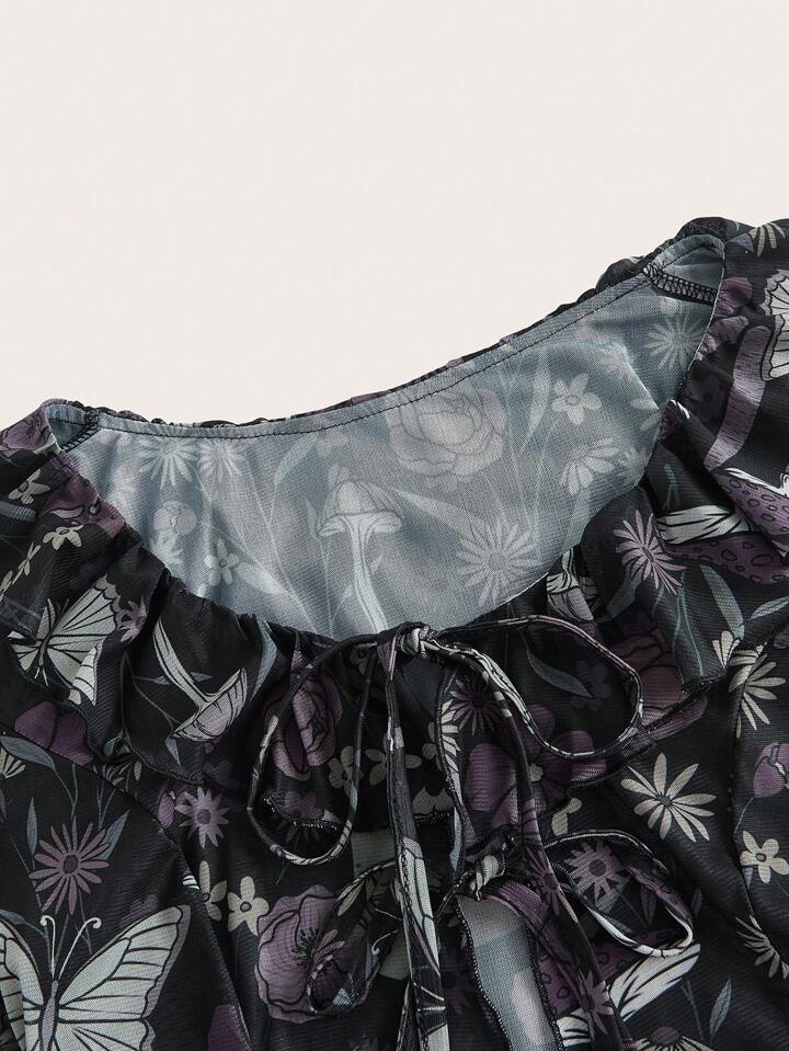 Butterfly Floral Print Tie Front Ruffle Trim Mesh Top