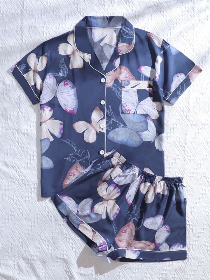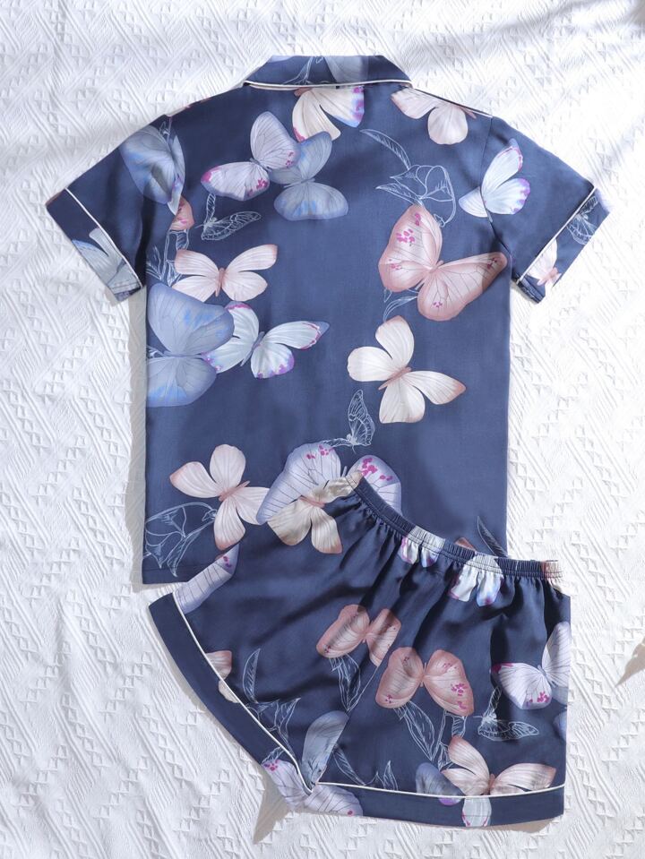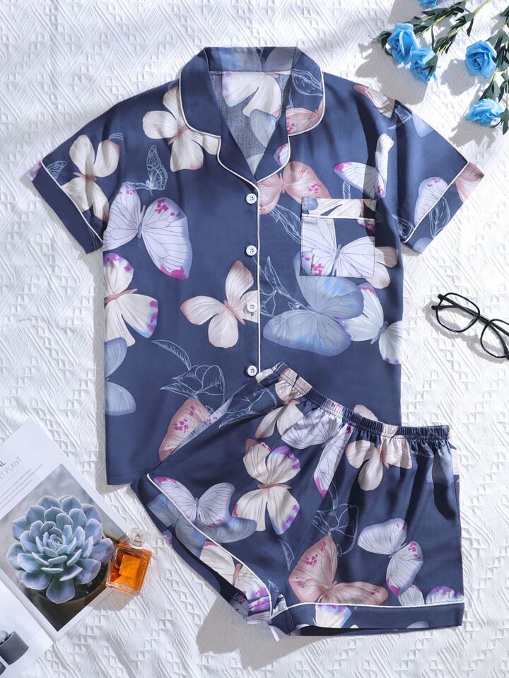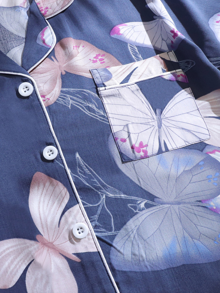 Butterfly Print Lapel Collar Pajama Set