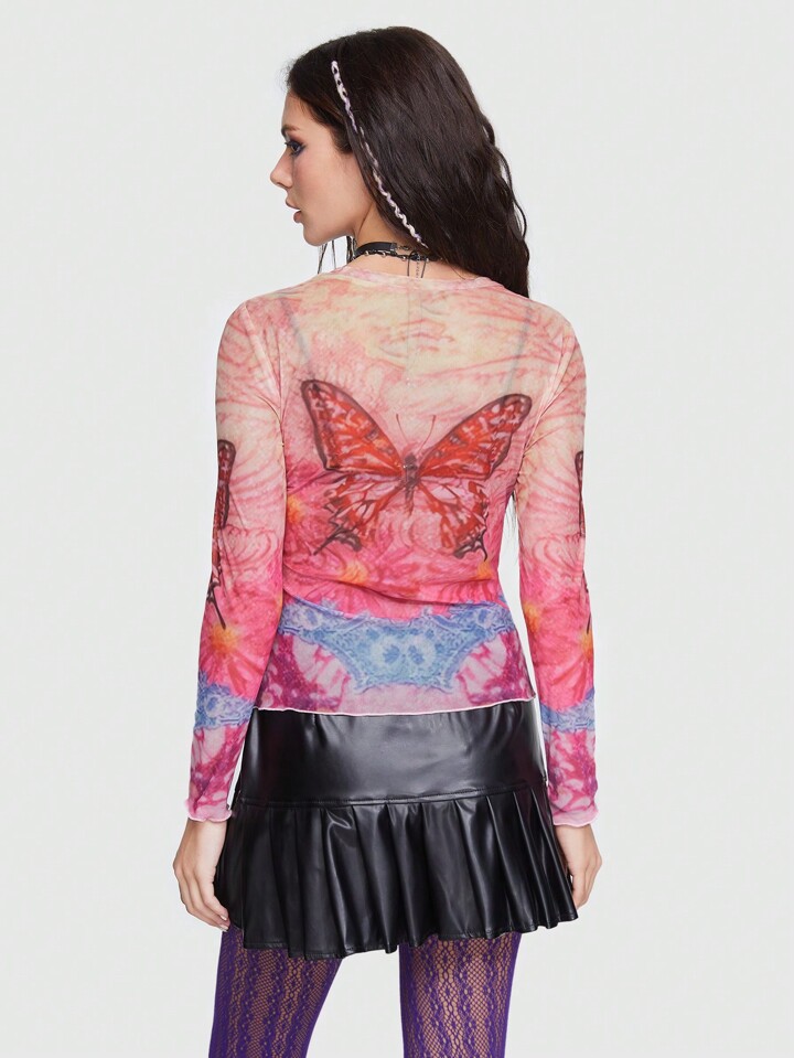 Butterfly Print Lettuce Trim Mesh Top Without Bra