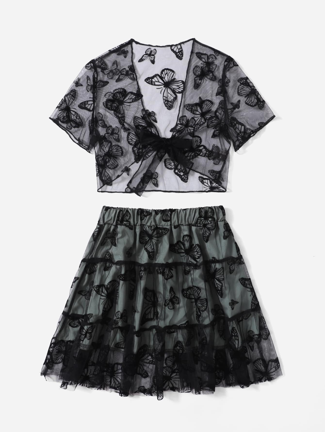 Butterfly Print Tie Front Top & Contrast Mesh Skirt