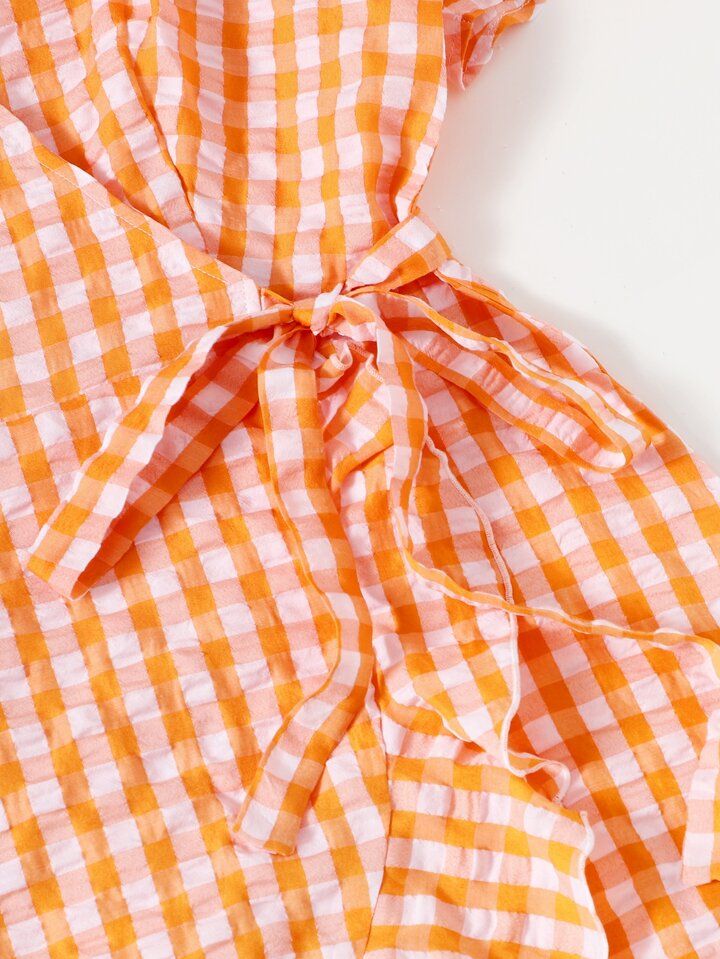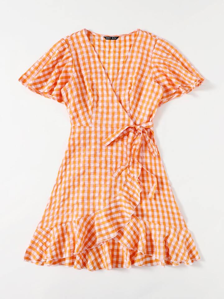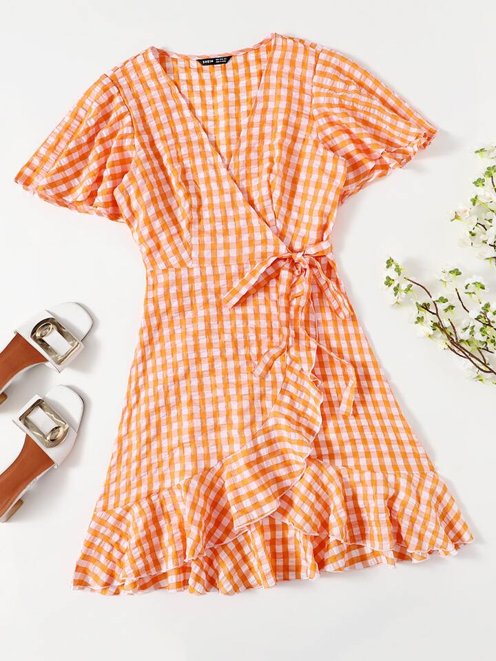 Butterfly Sleeve Wrap Ruffle Hem Knot Gingham Dress