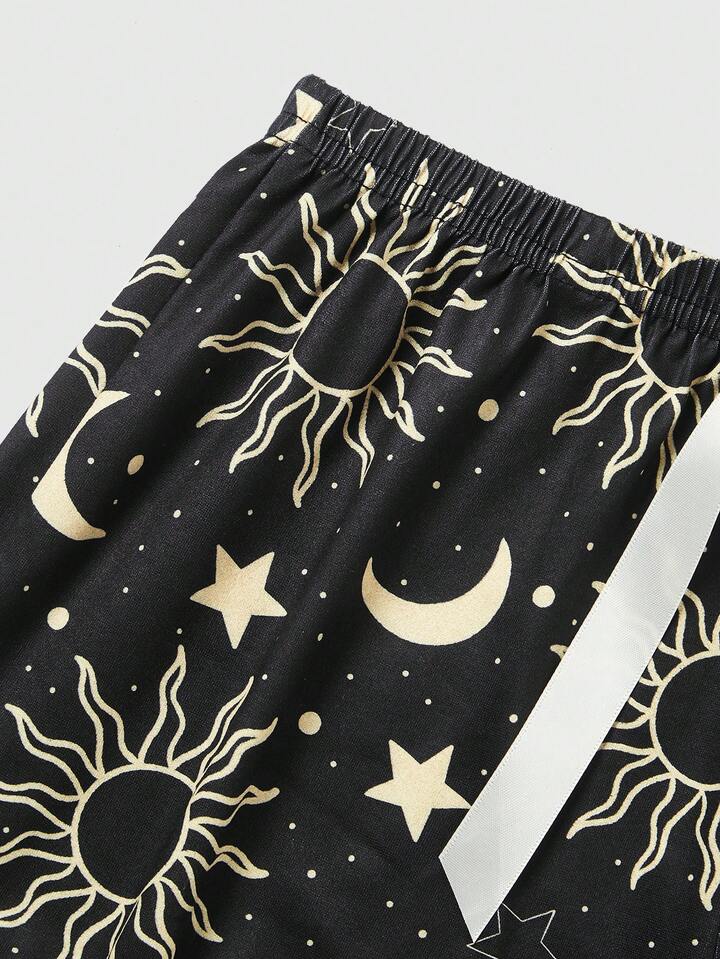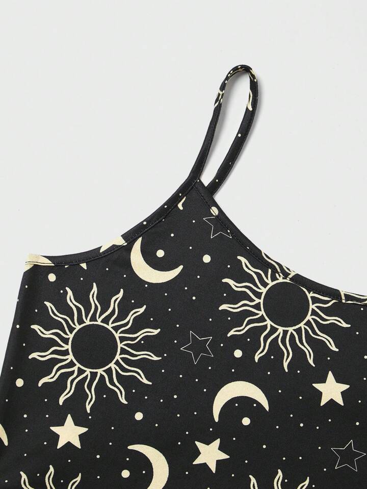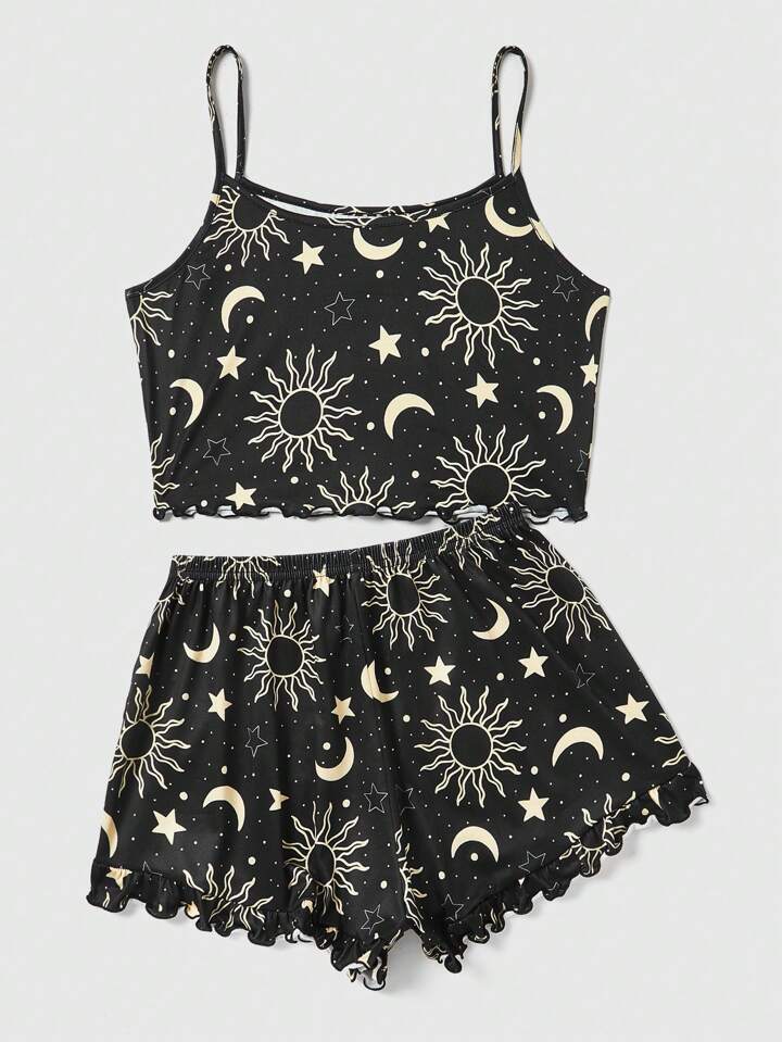 Carolina Leite Women's Gothic Digital Print Moon, Stars & Sun Design Lettuce Edge Cami & Shorts Sleepwear Set, Black, School